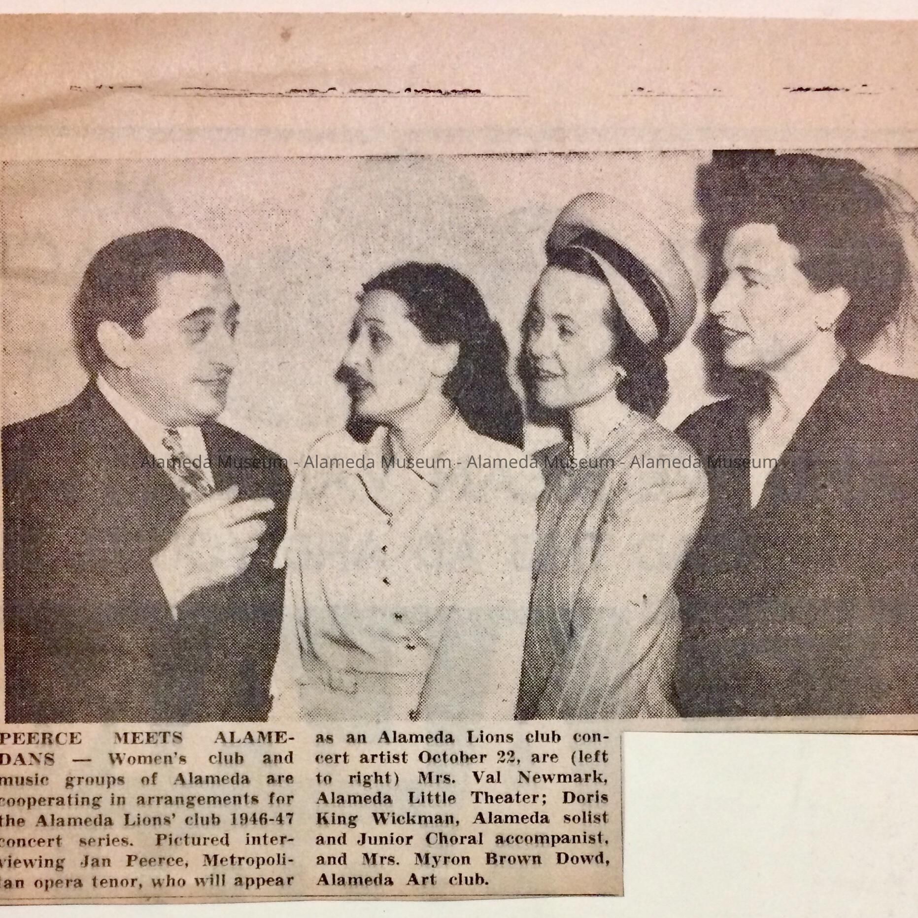 HISTORY OF OBJECT: AN ILLUSTRATED NEWSPAPER CLIPPING WITH MEMBERS OF THE ALAMEDA LIONS CLUB AND THE LATE OPERA STAR, JAN PEERCE (METROPOLITAN OPERA CO.). MR. PEERCE WAS SCHEDULED TO PERFORM FOR THE ORGANIZATION.