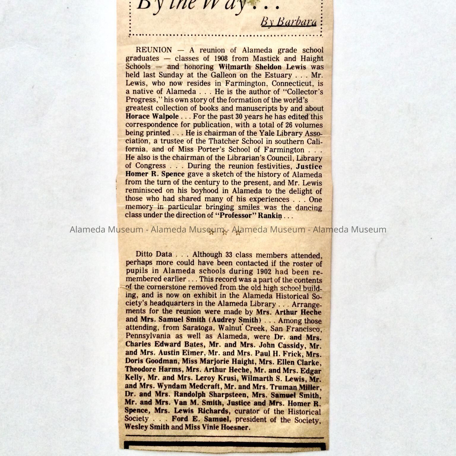 History: Newspaper clipping concerning a reunion of the Classes of 1908 Mastrick and Haight Schools where they honored Wilmarth Sheldon Lewis. Mr. Lewis, a native of Alameda, who was the author of the Collector's Progress and a Chairman of the Yale Library Association with a varied background in education.