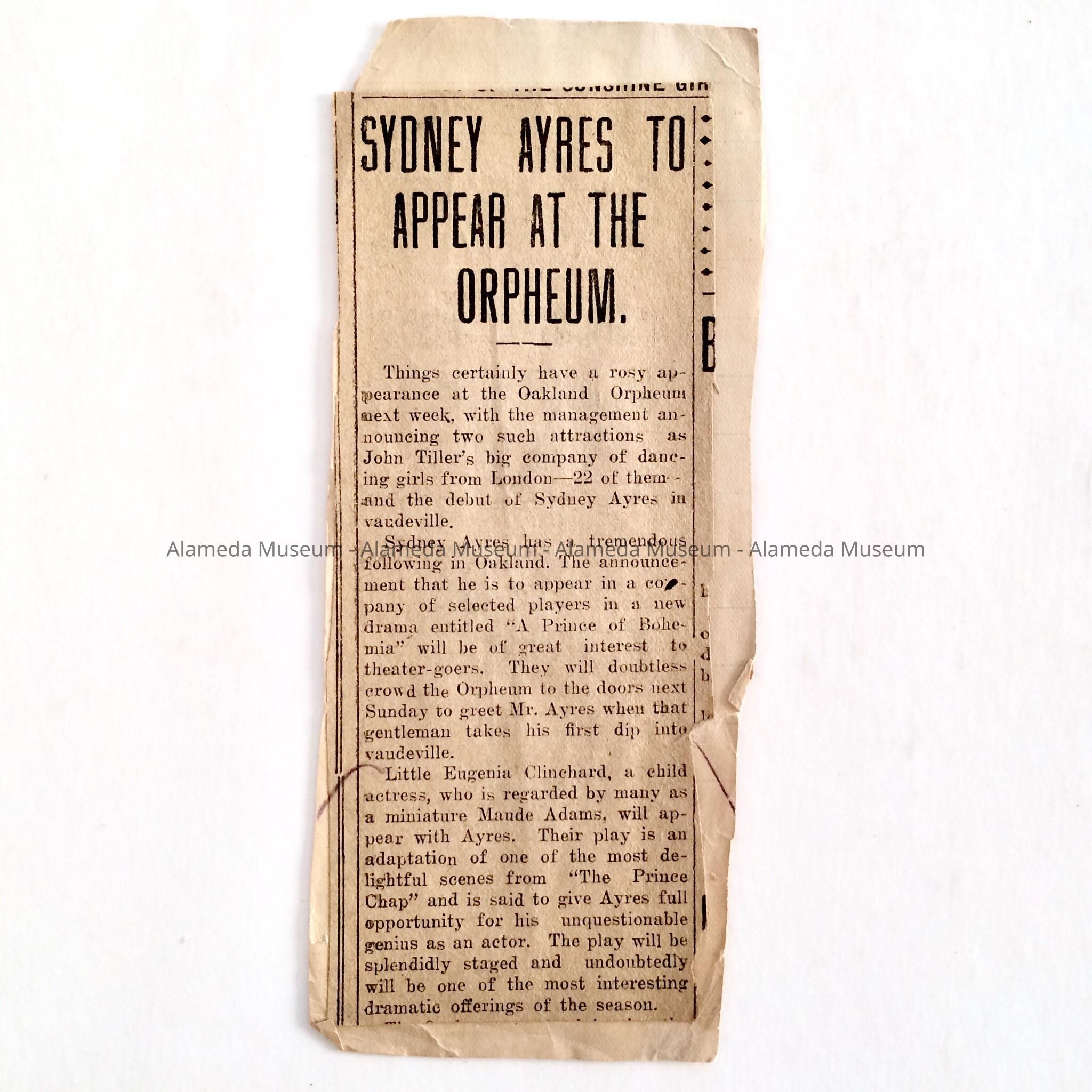 Clipping 'Sydney Ayres To Appear At The Orpheum' with Eugenia Clinchard, early 1900sEntry/Object ID