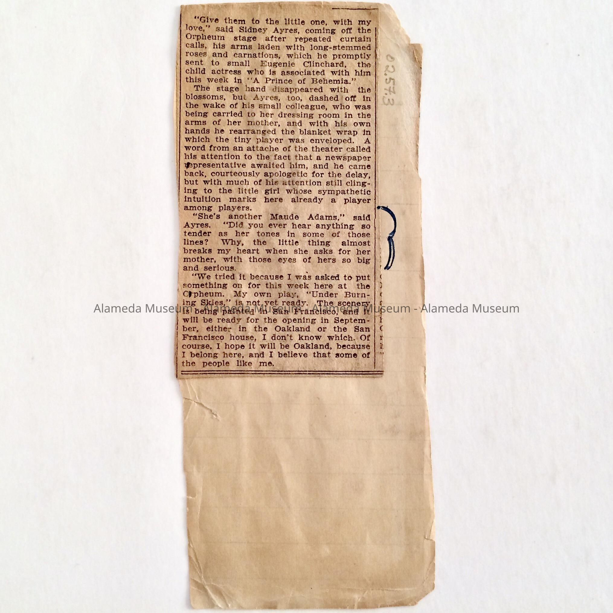 Newspaper clipping concerning a play at the Oakland Orpheum Theatre starring Sydney Ayres and supported by Eugenia Clinchard, Alameda child actress.