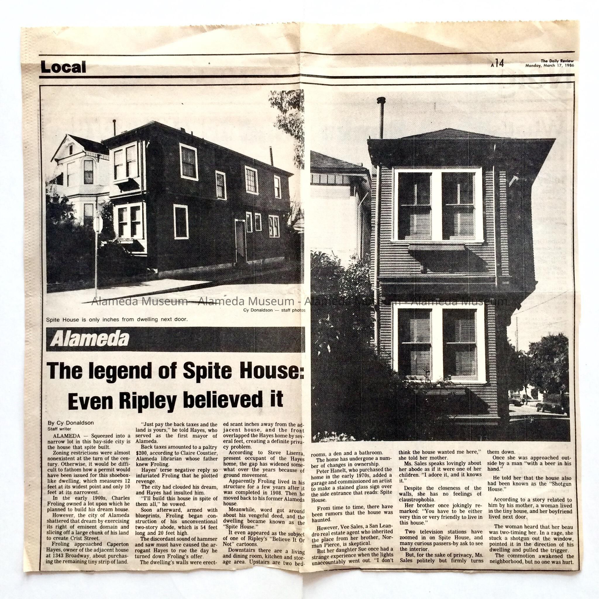 Newspaper clipping from the Daily Review dated March 17, 1986 concerning the Spite House at 2528 Crist Street, corner of Broadway.