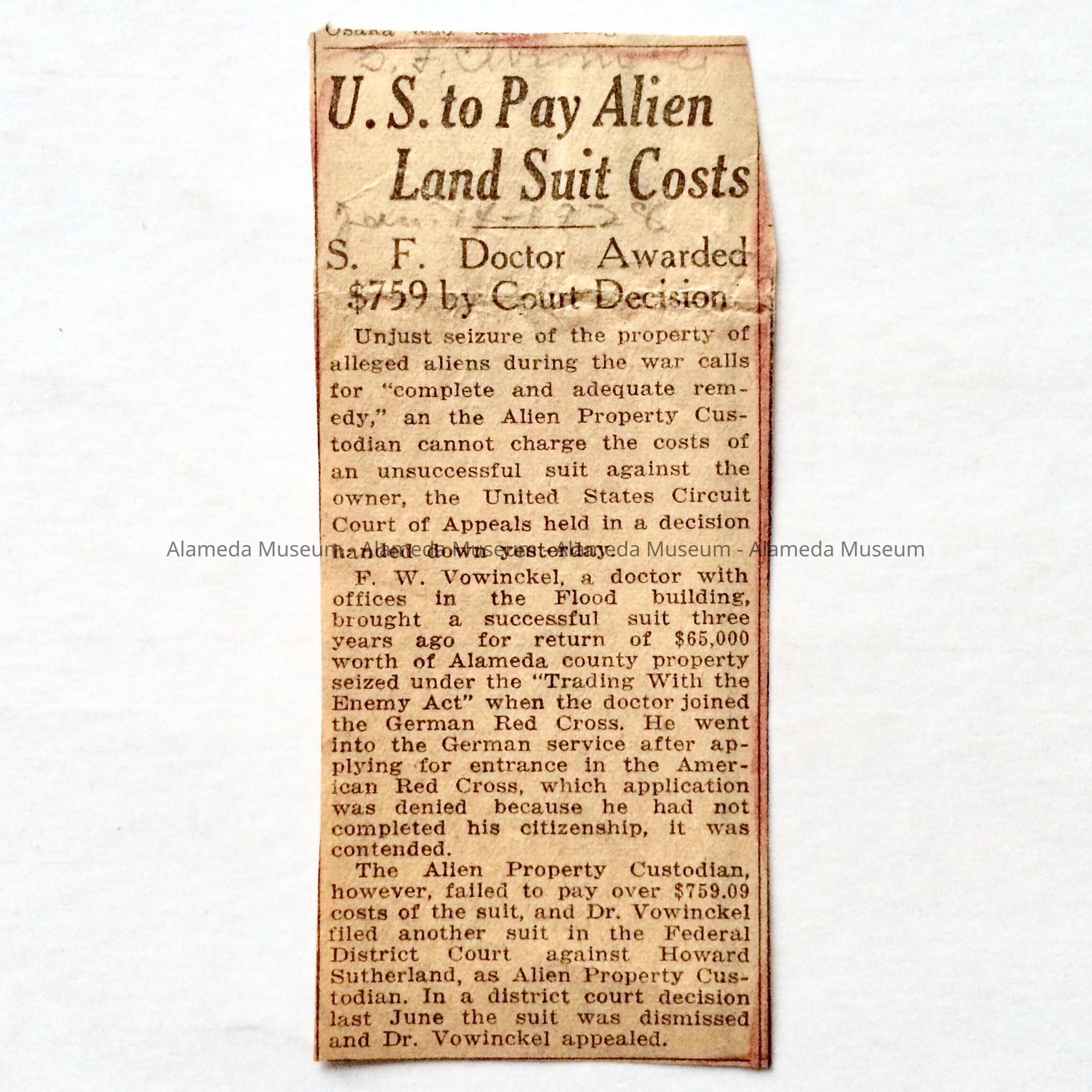 Clipping, 'U.S. to pay Alien Land Suit Costs', 1938Entry/Object ID
