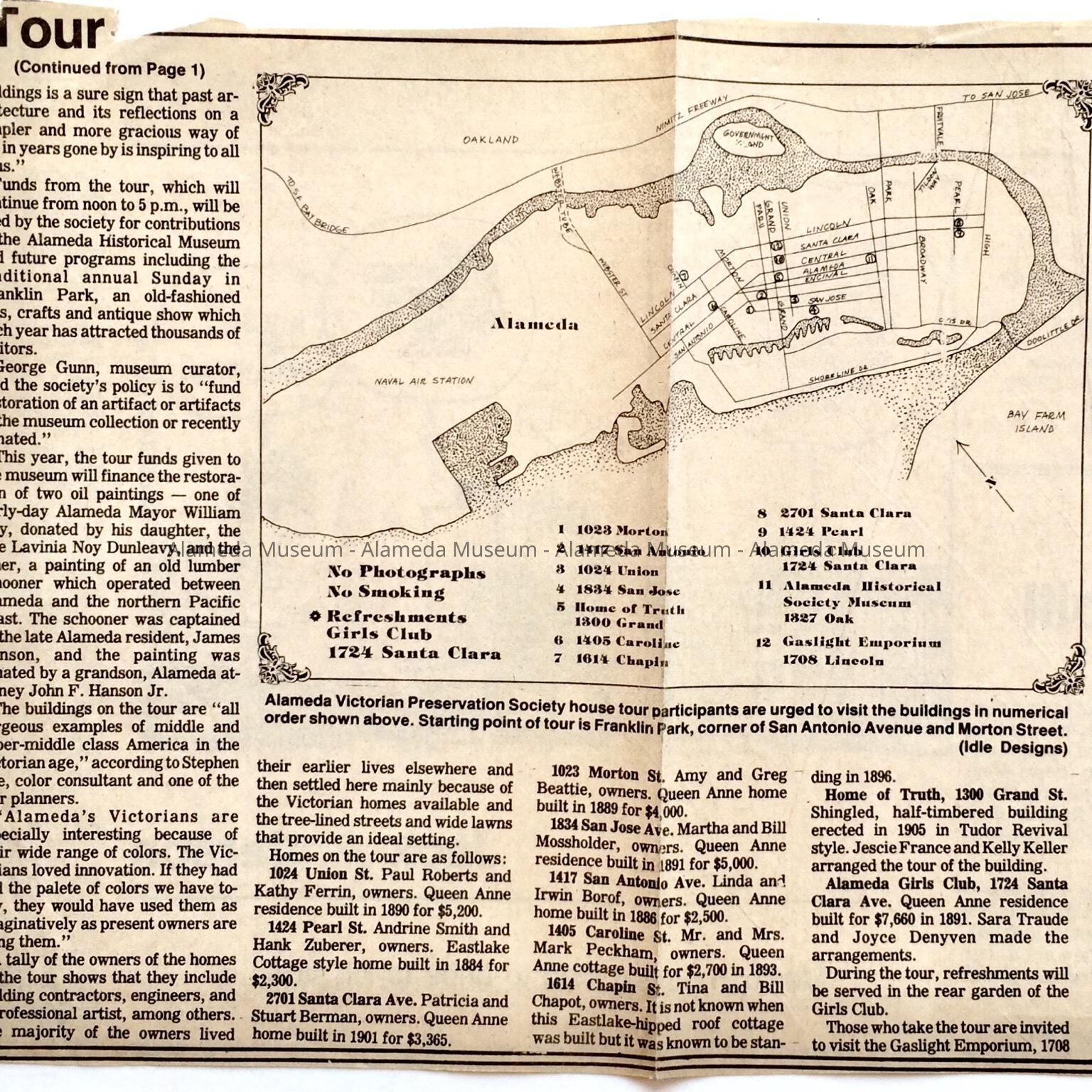 HISTORY OF OBJECT: A NEWSPAPER CLIPPING FROM THURSDAY, OCTOBER 2, 1986, CONCERNING HOUSES TO BE INCLUDED ON THE ALAMEDA VICTORIAN PRESERVATION SOCIETY HOUSE TOUR (THE 10TH) ON SUNDAY, OCTOBER 5, 1986.