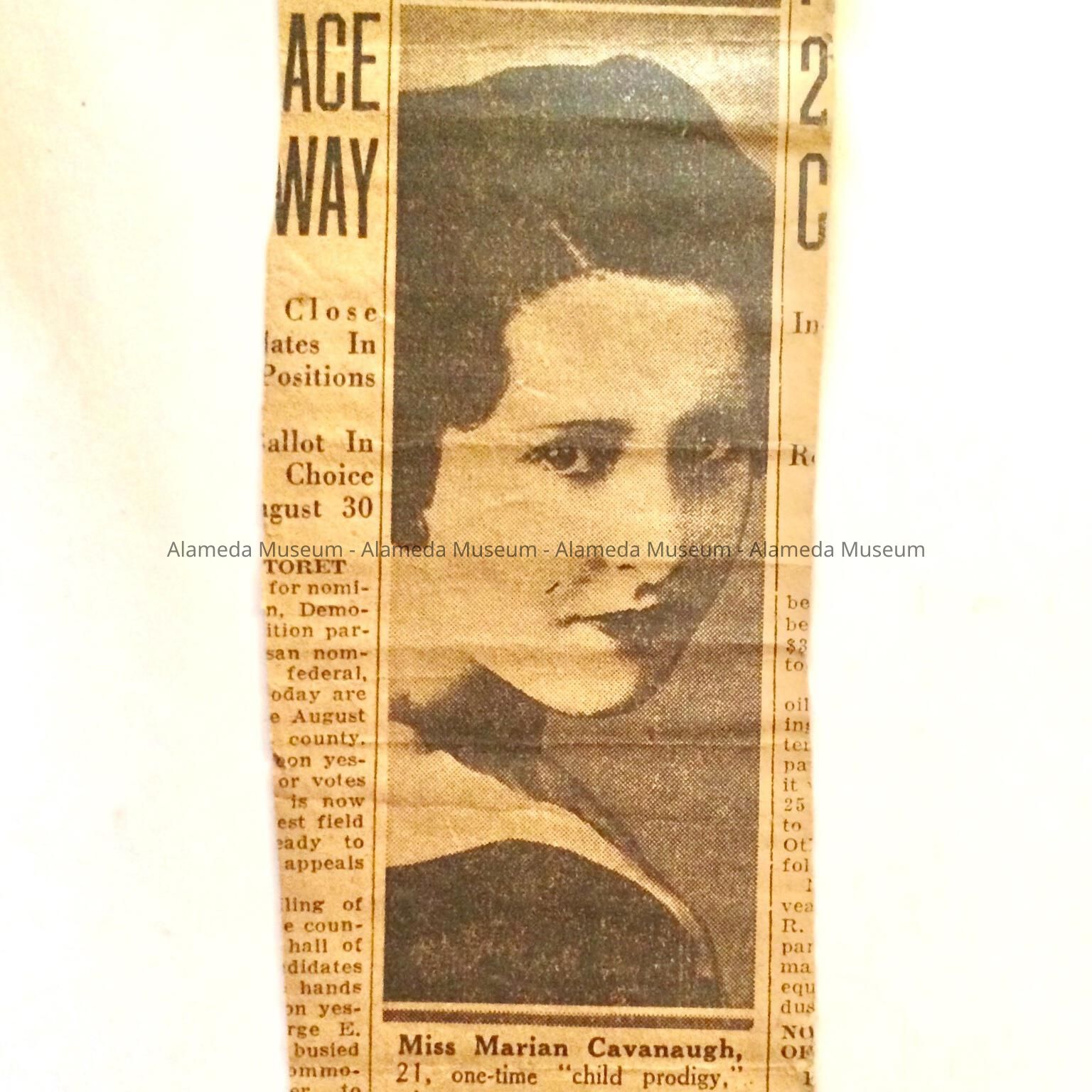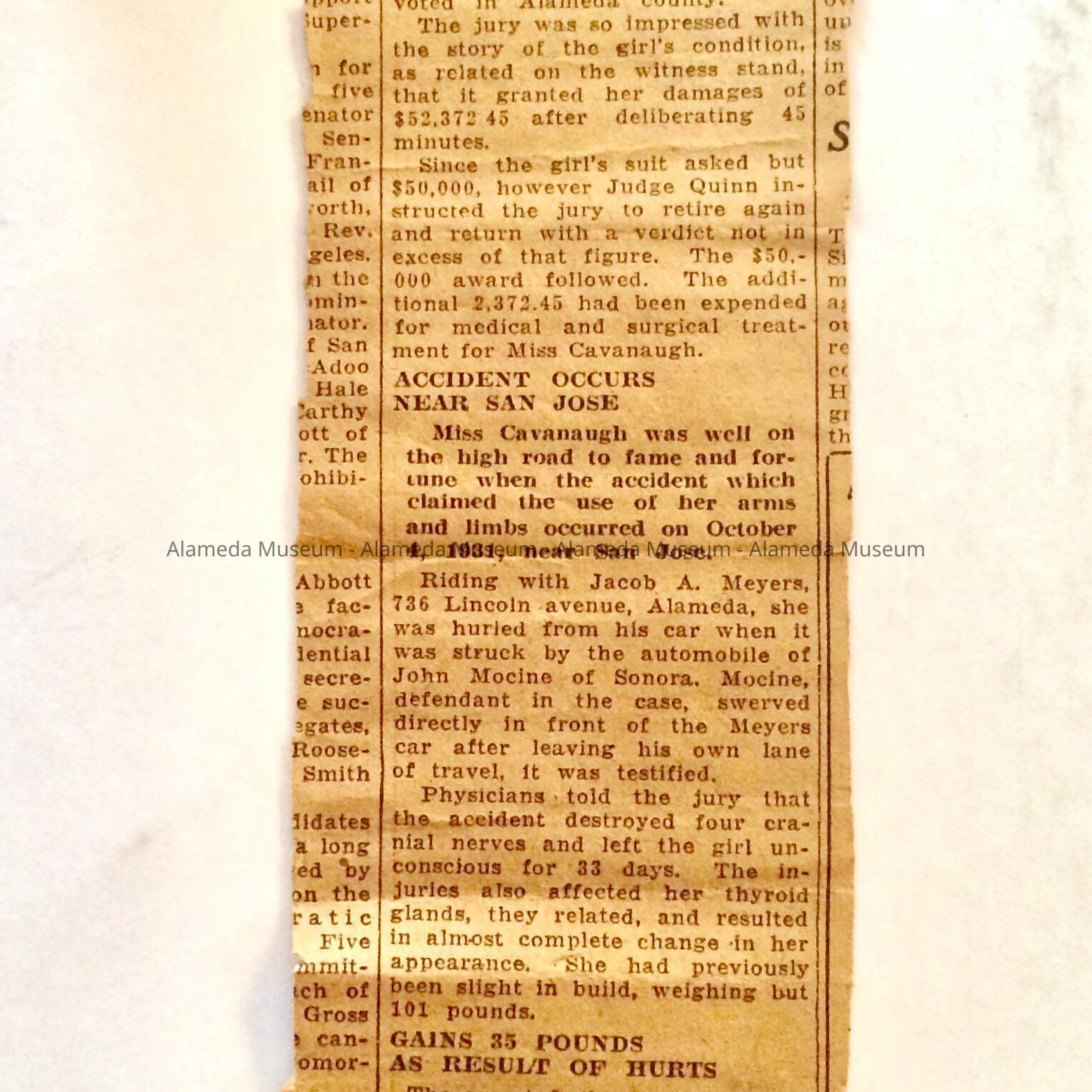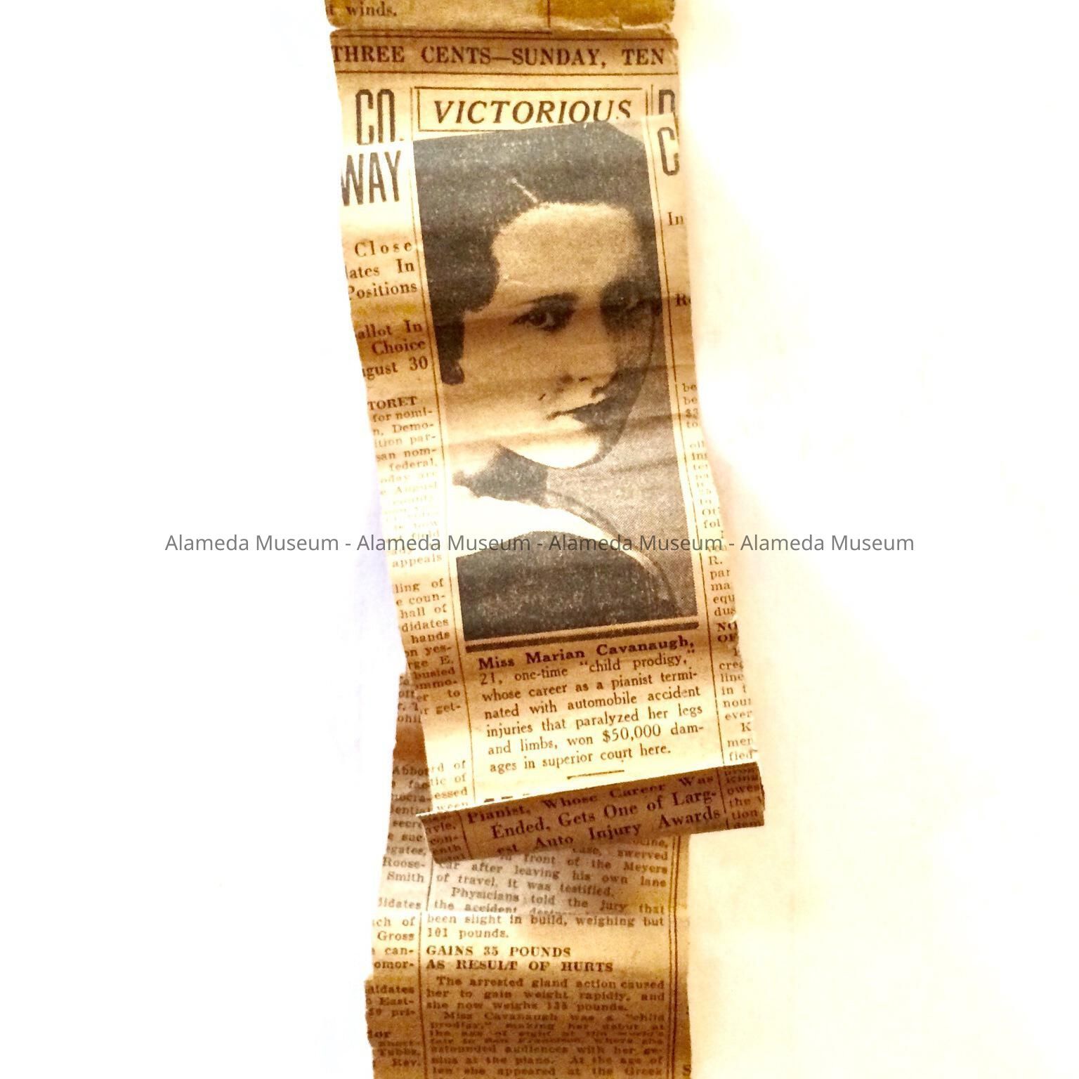 History of Object: Newspaper article clipping concerning Marion Cavanaugh, the child piano prodigy raised in Alameda, severely injured in an auto accident and who ultimately received an injury settlement of $50,000, which was a huge amount in those years.
