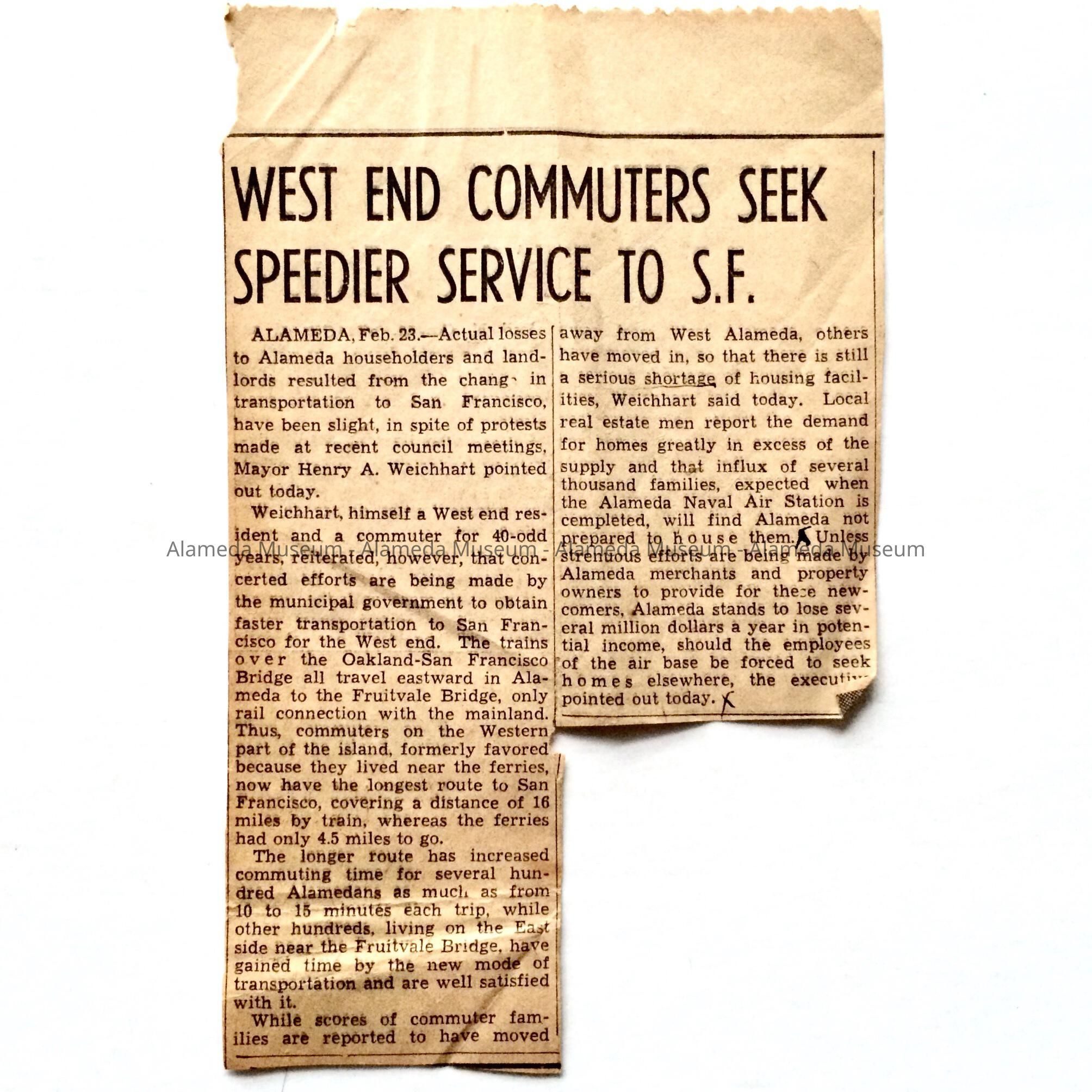 DESCRIPTION: A NEWSPAPER CLIPPING WITH BOLD-PRINTED CAPTION, "WEST END COMMUTERS SEEK SPEEDIER SERVICE TO SAN FRANCISCO."