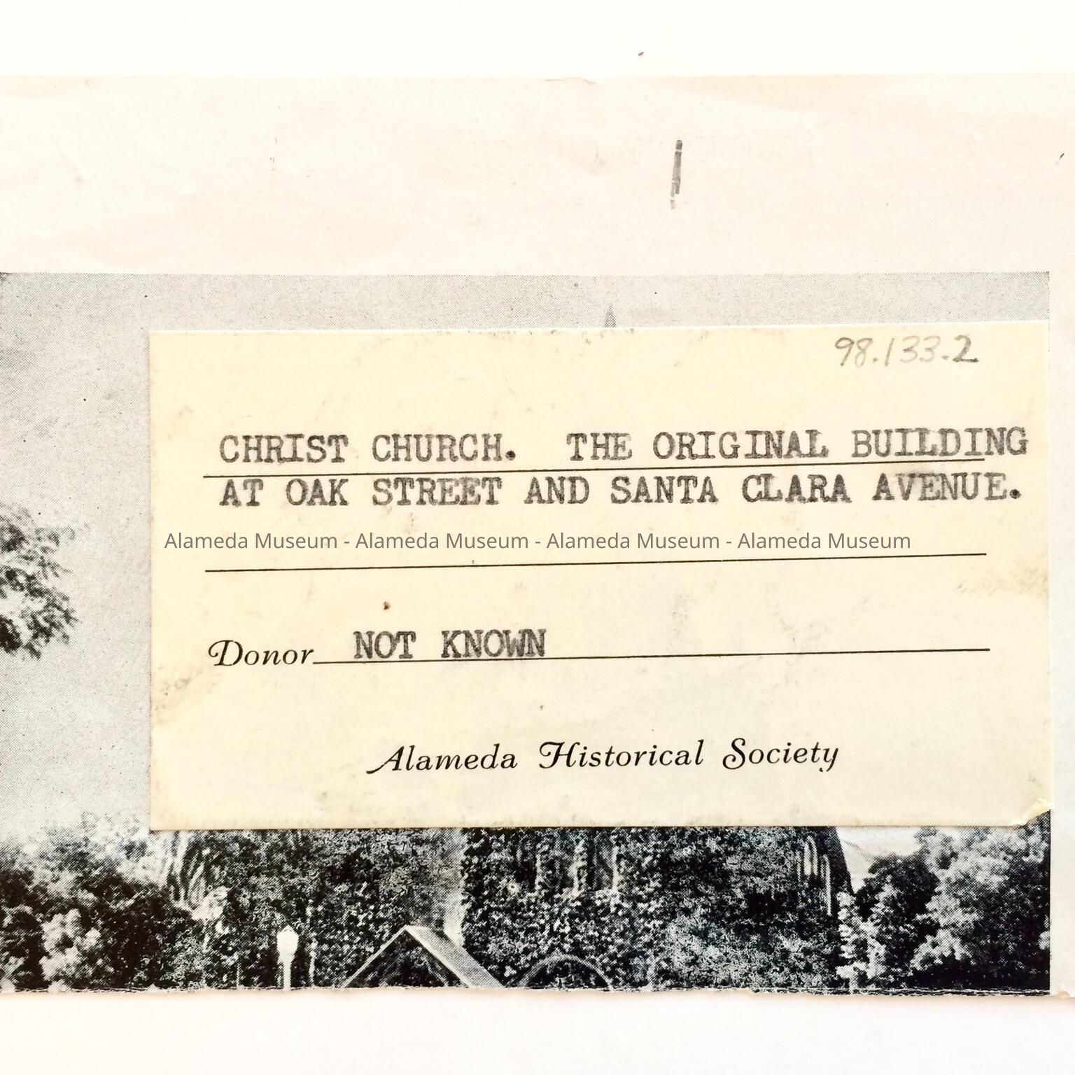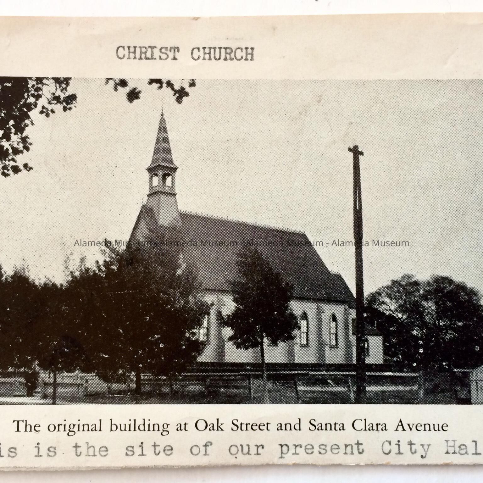 RARE PHOTOGRAPHIC IMAGE OF THE ORIGINAL EPISCOPAL CHURCH WHICH WAS SITUATED AT OAK STREET AND SANTA CLARA AVENUE, ALAMEDA, PRIOR TO CONSTRUCTION OF THE ALAMEDA CITY HALL IN 1895. CLIPPING, NUMBERED "22," IS PART OF THE ORIGINAL ALAMEDA HISTORICAL SOCIETY COLLECTION. IT WAS GIVEN PRIOR TO 1971 AND NOT OFFICIALLY CATALOGED UNTIL PRESENT.