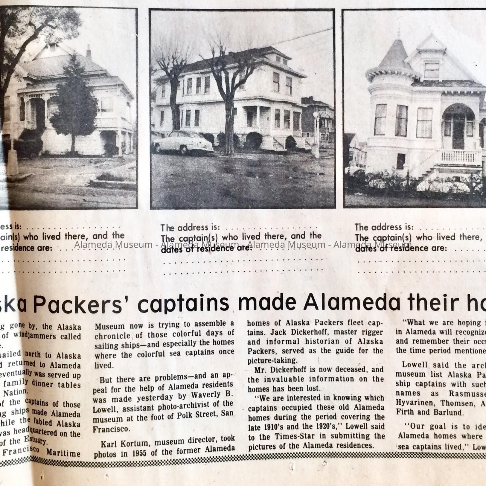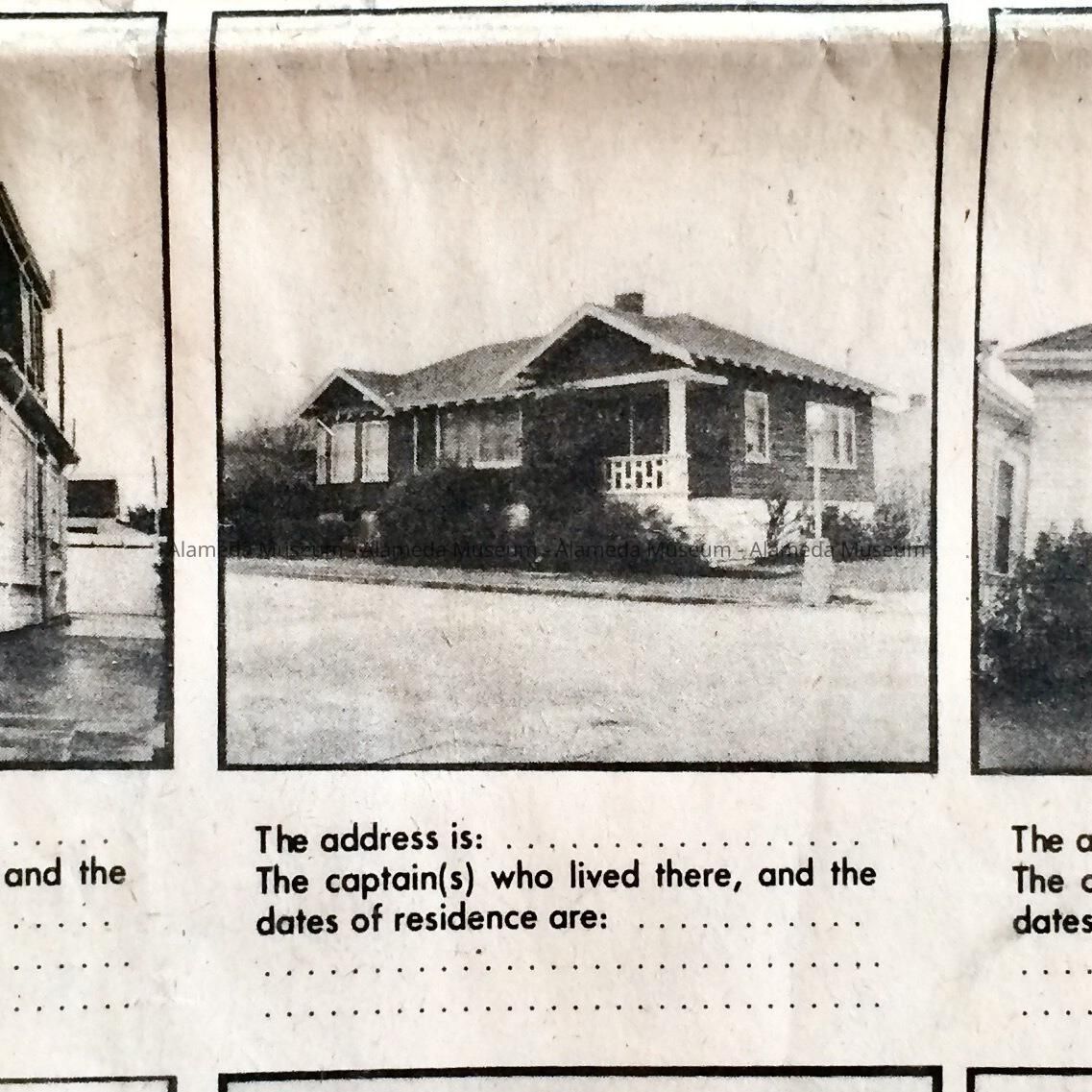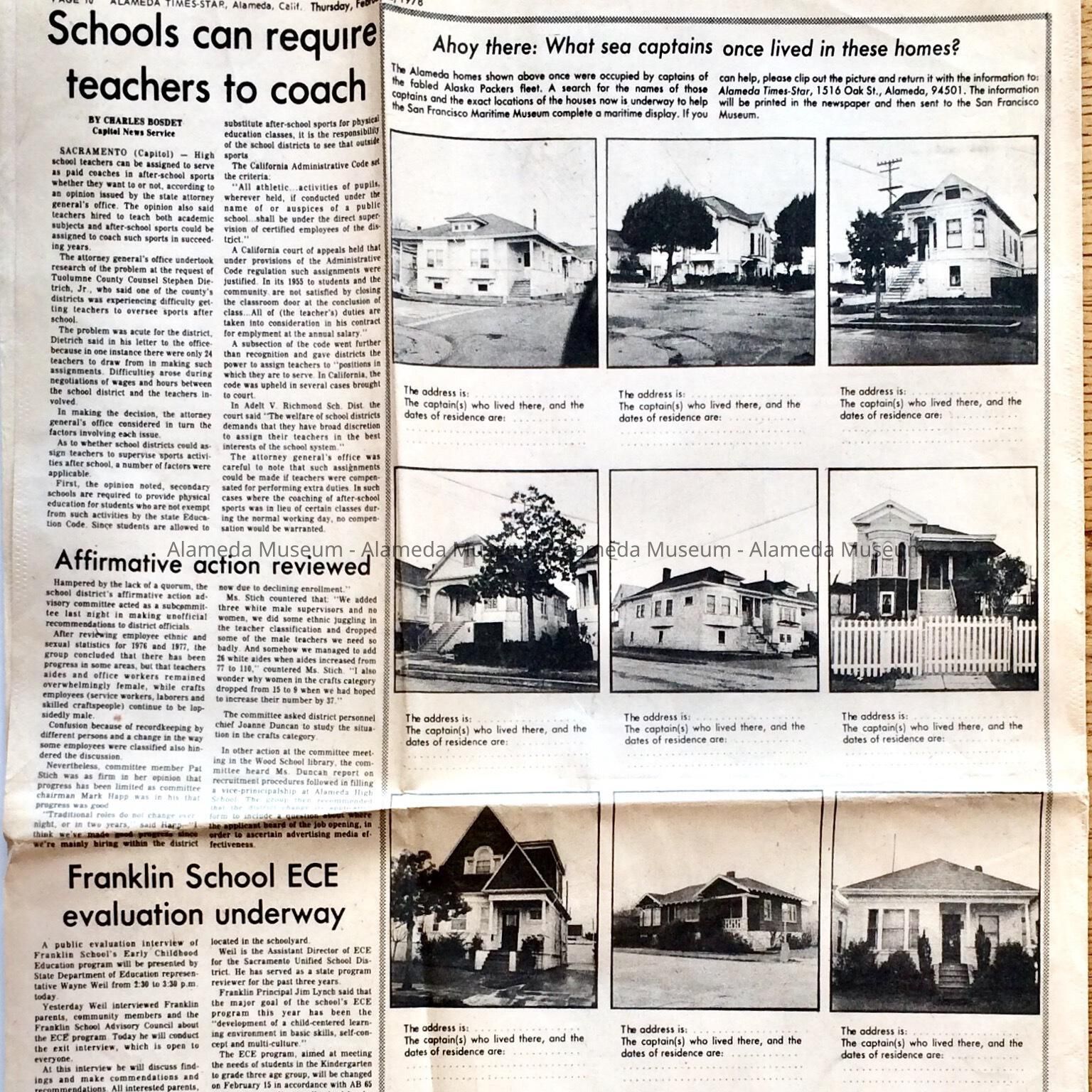 History: Newspaper clipping from the Alameda Times Star of February 2, 1978 with photographs of Alameda homes of the late 19th and early 20th century seeking information from the public on sea captains who might have lived at the residences.