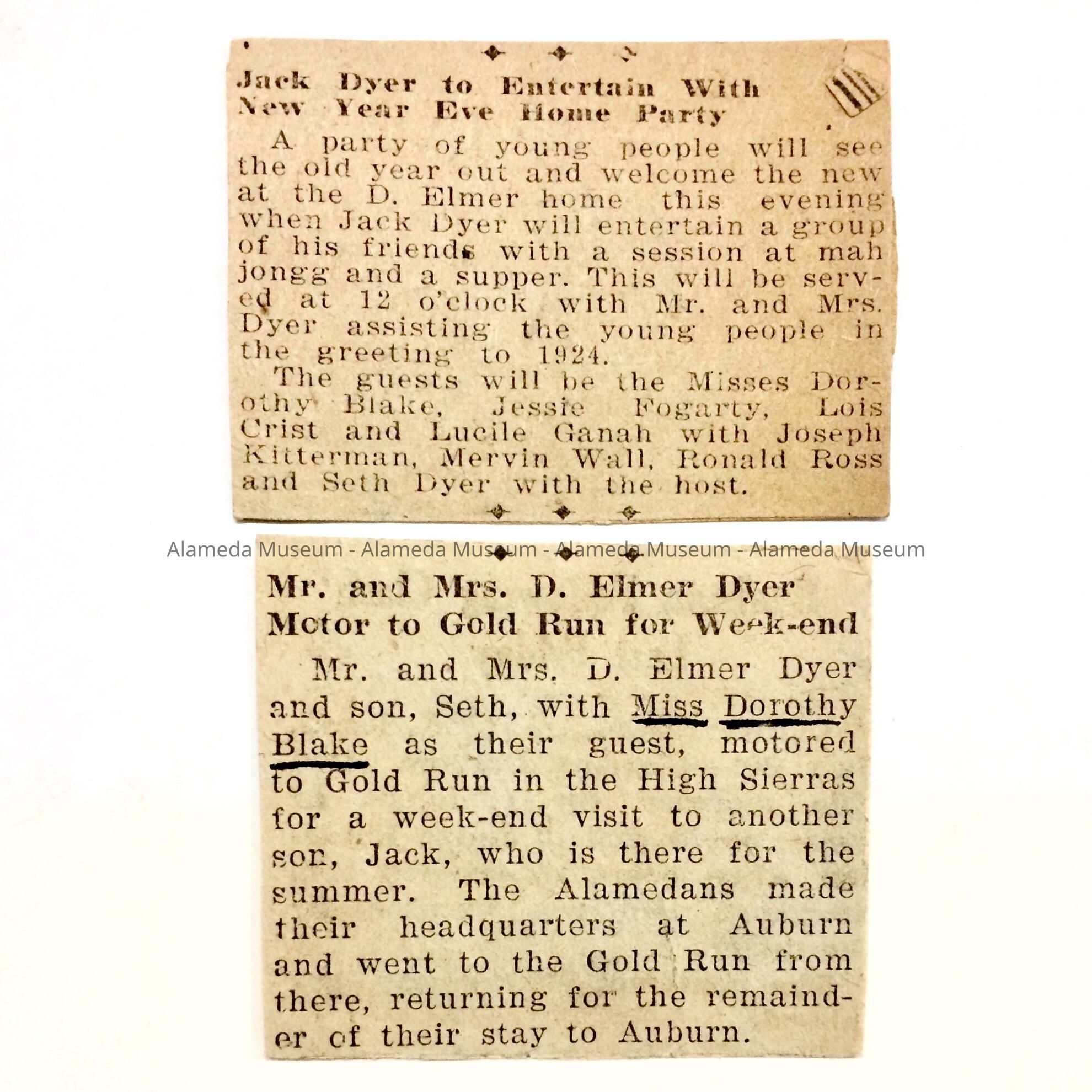 A. NEWSPAPER CLIPPING CONCERNING A PARTY TO BE HELD BY JACK DYER AT HIS HOME ON CHESTNUT STREET IN ALAMEDA. AMONG THE GUESTS WAS DOROTHY BLAKE.