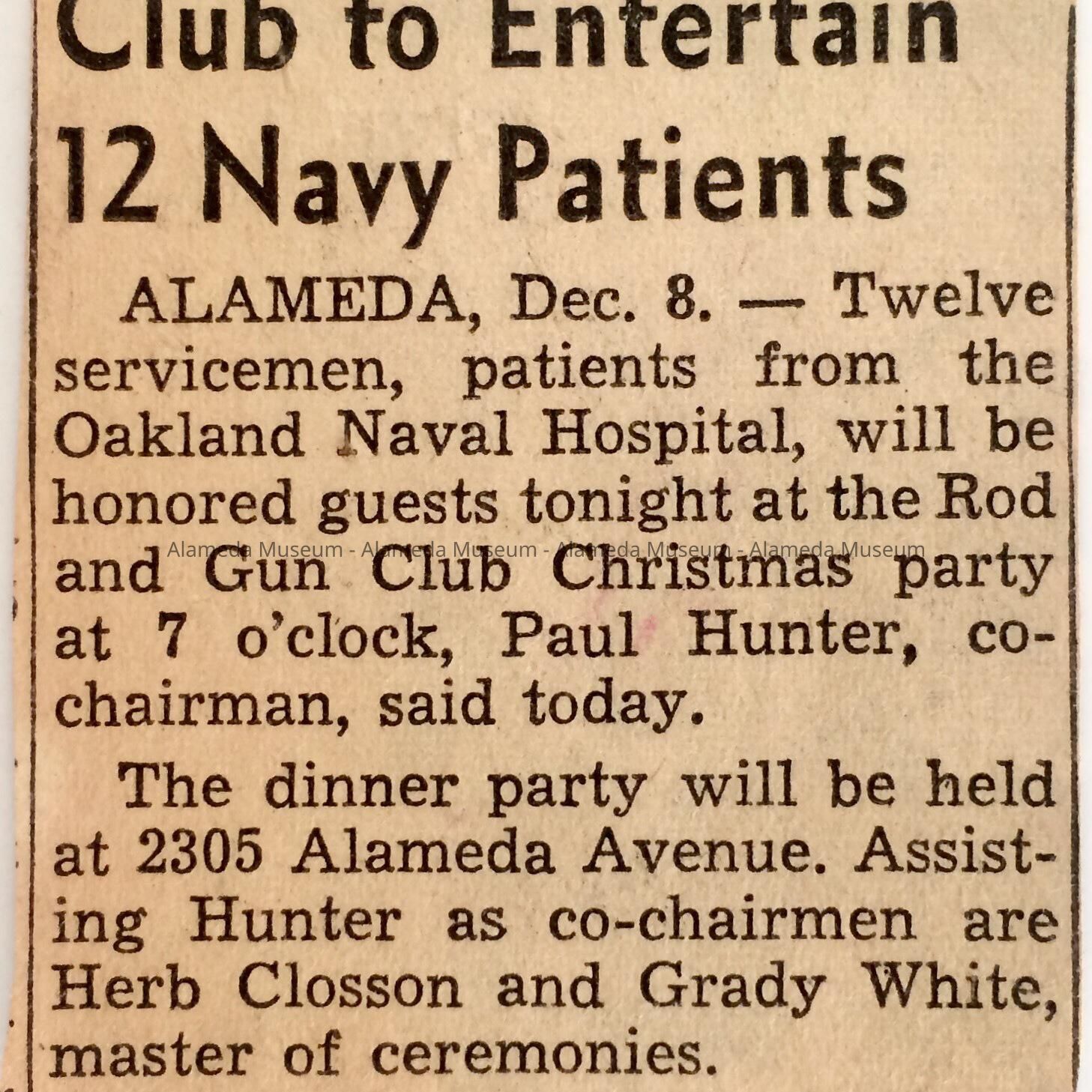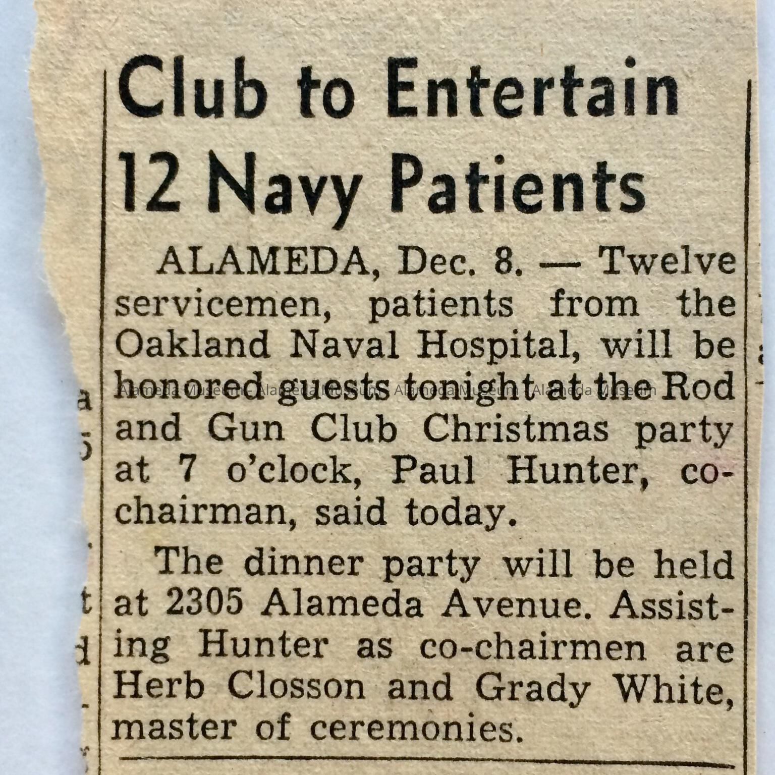 A CLIPPING CONCERNING A DINNER TO BE HELD WITH SERVICEMEN FROM THE OAKLAND (OAK KNOLL) NAVAL HOSPITAL AS GUESTS, HELD UNDER THE AUSPICES OF THE ROD AND GUN CLUB. THE LATE GRADY WHITE WAS THE MASTER OF CEREMONIES.