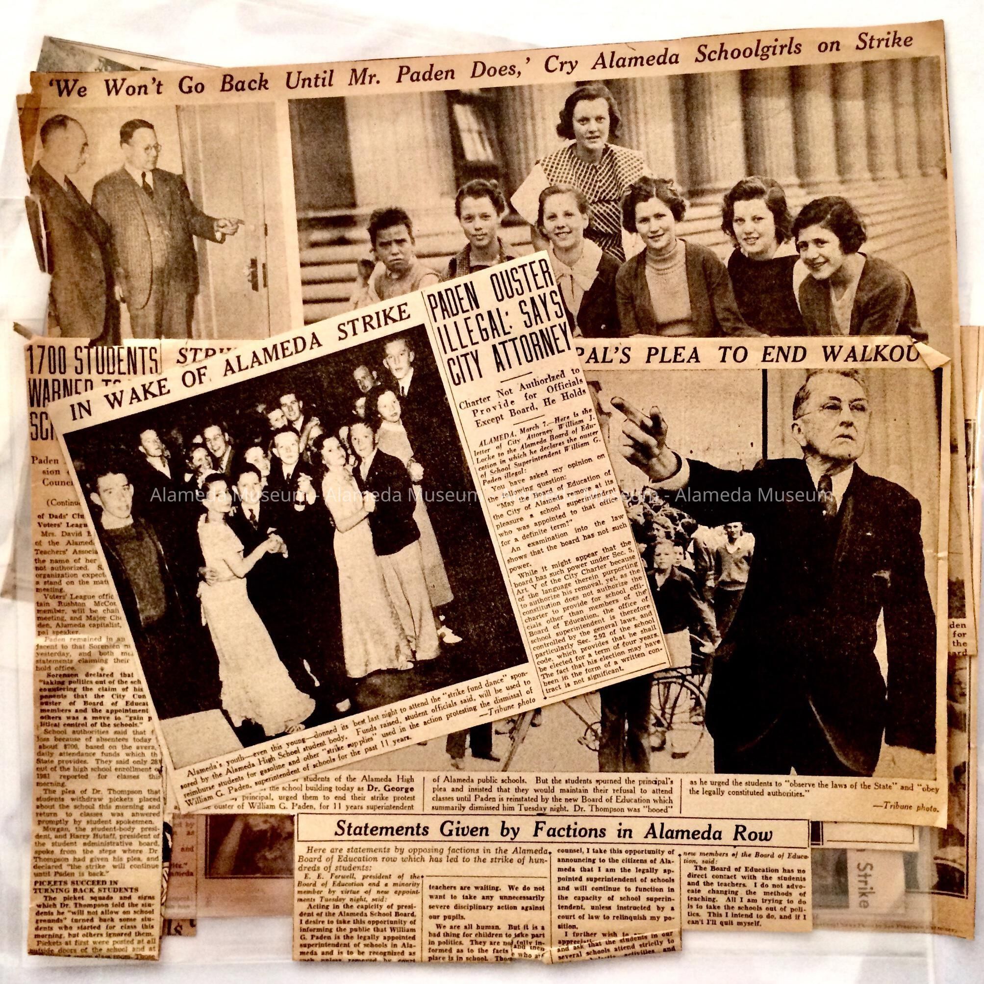 NEWSPAPER CLIPPINGS CONCERNING THE STUDENT STRIKE OF THE ALAMEDA HIGH SCHOOL IN 1936. STUDENTS WERE STRIKING AGAINST THE OUSTING OF WILLIAM G PADEN.