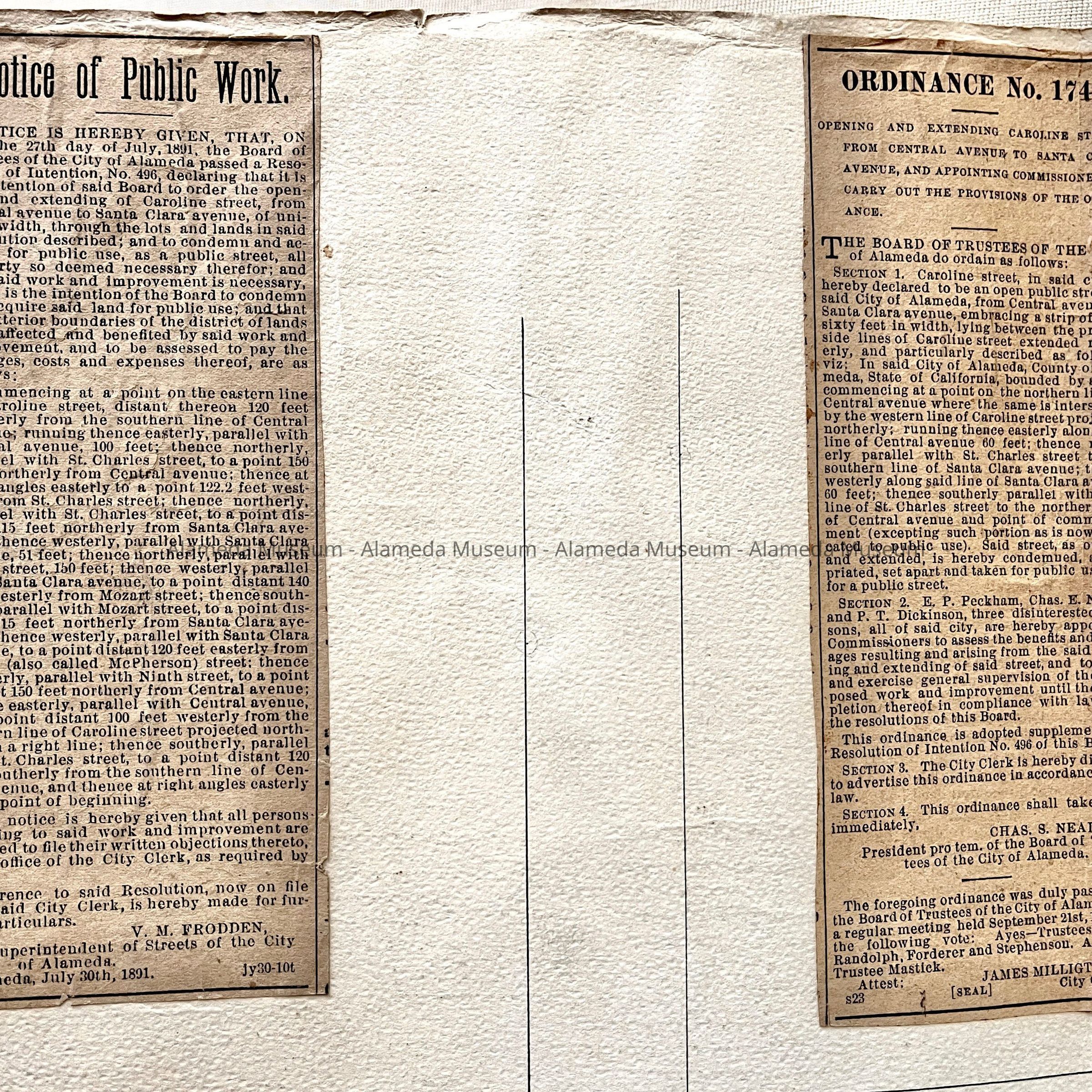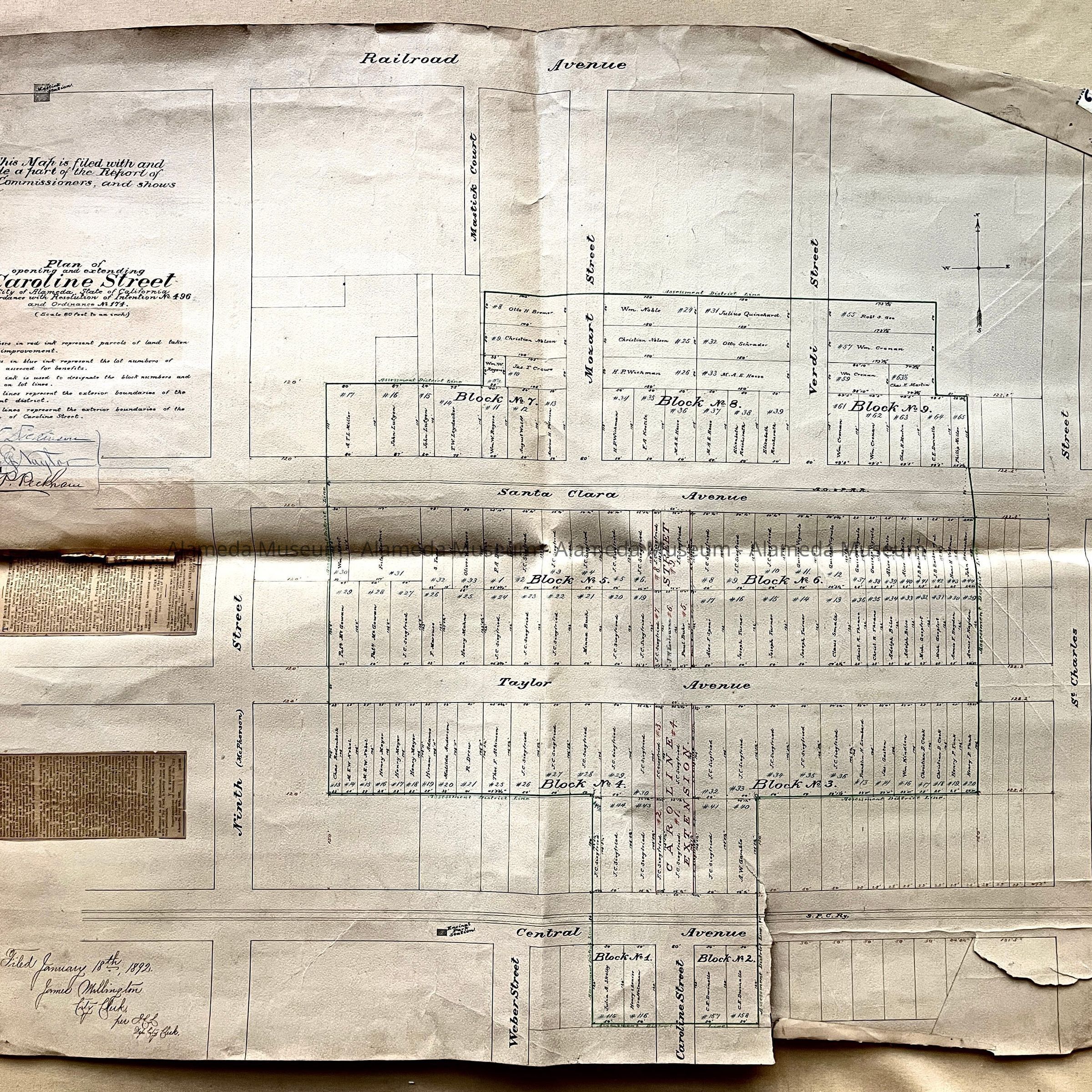 HISTORY OF OBJECT: MAP THAT WAS CREATED FOR A REPORT MADE TO A COMMISSION FOR THE ADOPTION OF A RESOLUTION OPENING CAROLINE STREET FROM CENTRAL AVENUE TO SANTA CLARA AVENUE. MAP WAS SIGNED JANUARY 18. 1892, BY THE THEN CITY CLERK JAMES MILLINGTON.