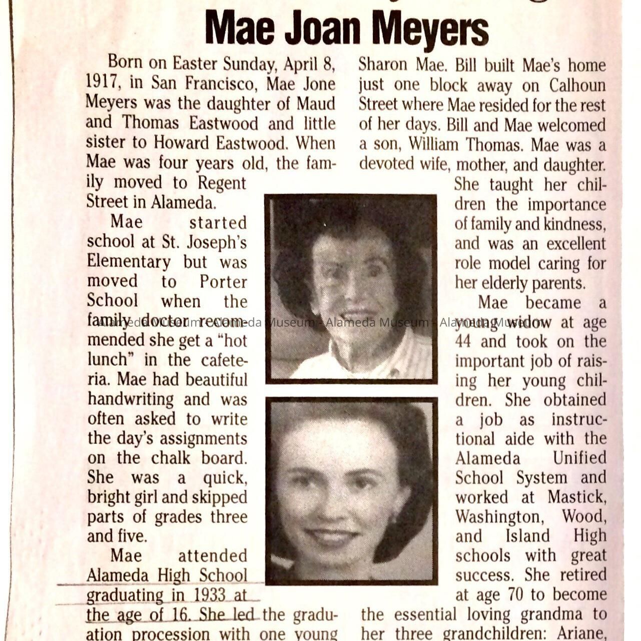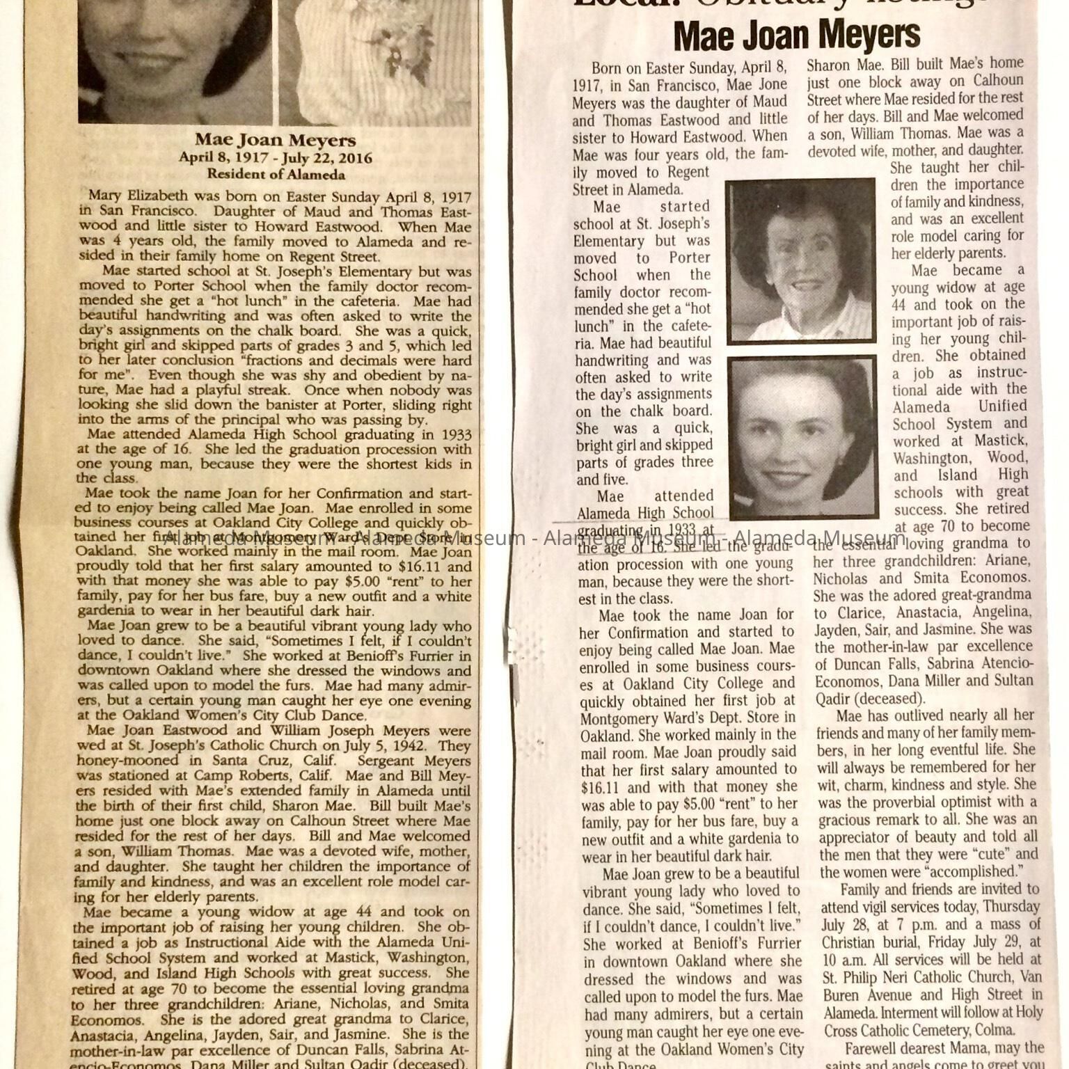 History of Object: Clipping of Obituary of Mae Joan Meyers (April 8, 1917, San Francisco - July 22, 2016, Alameda), daughter of Maud and Thomas Eastwood, who moved to Alameda when Mae Joan was 4 years old. She graduated from Alameda High School in 1933, and married and remained an Alameda resident for the rest of her life.