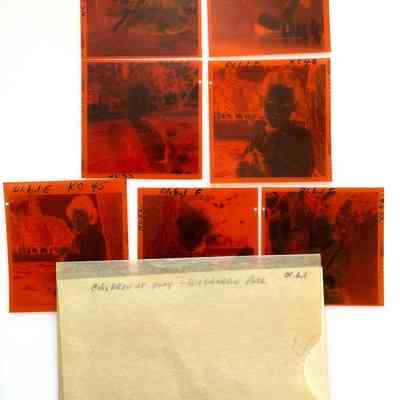 Description: Set of reddish celluloid photographic negatives. Photographer unknown.