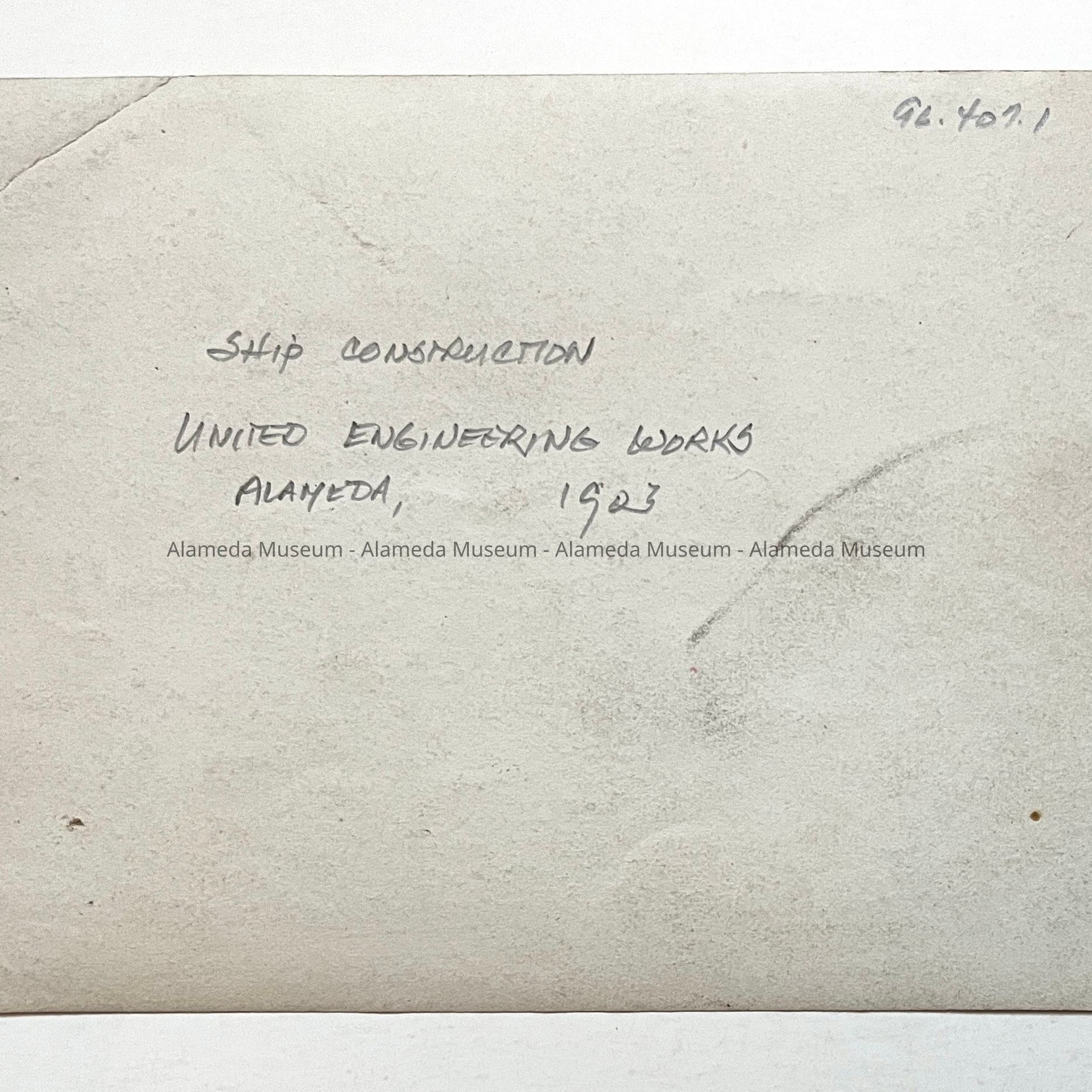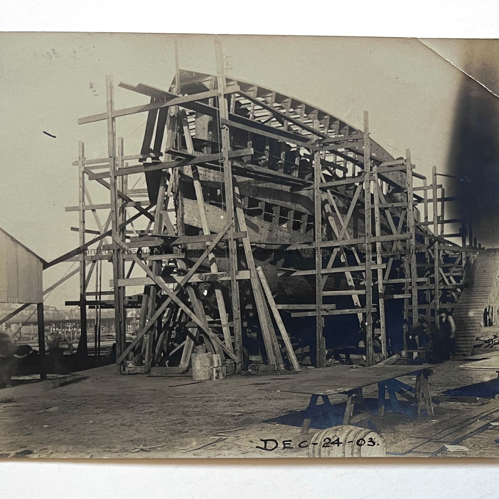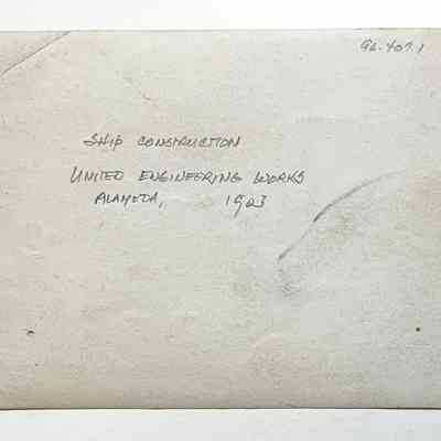 History of Object: Interesting close-up view of a vessel undergoing construction at what is believed to be the United Engineering Works shipyard at Alameda.