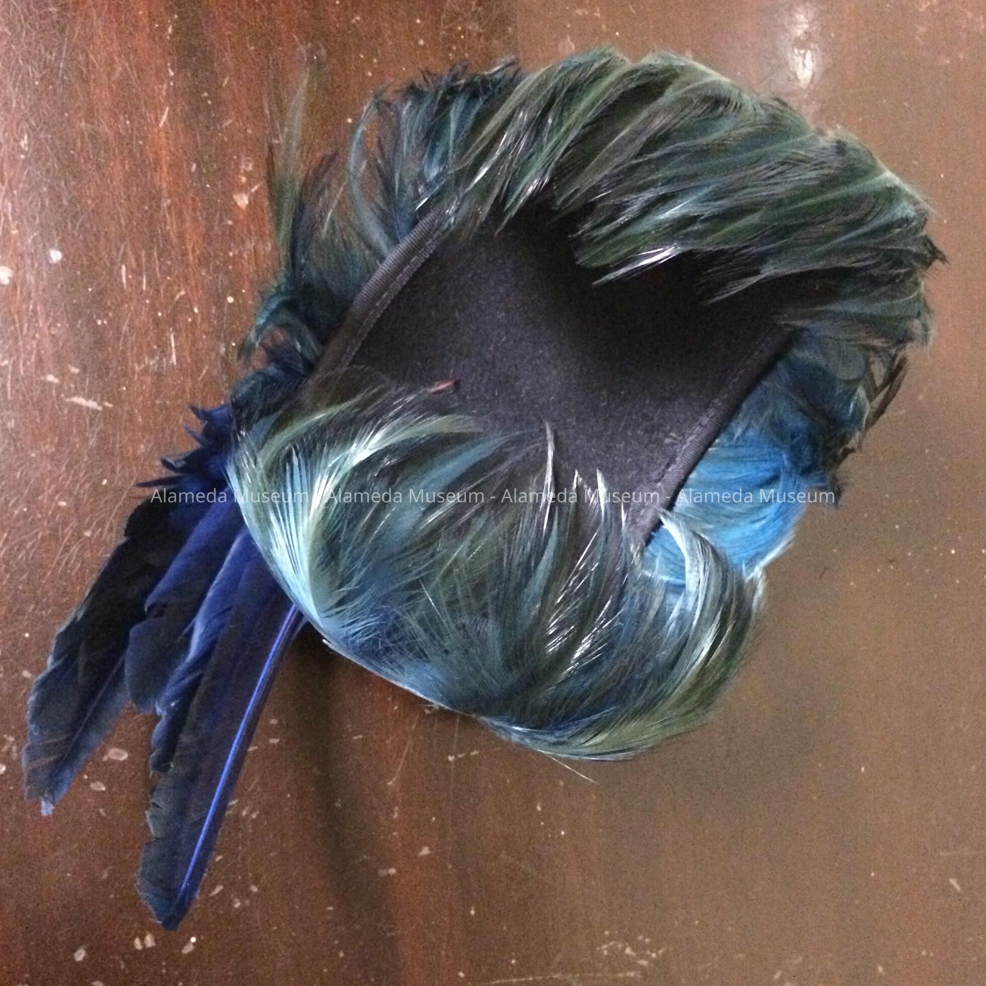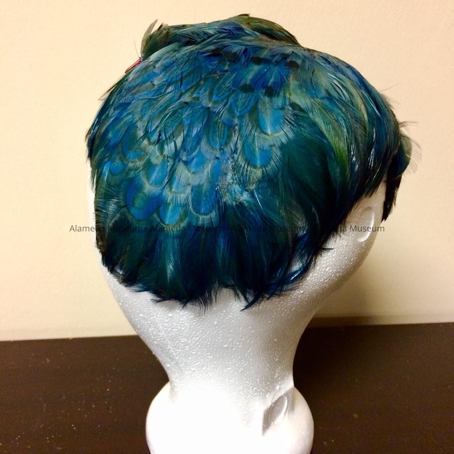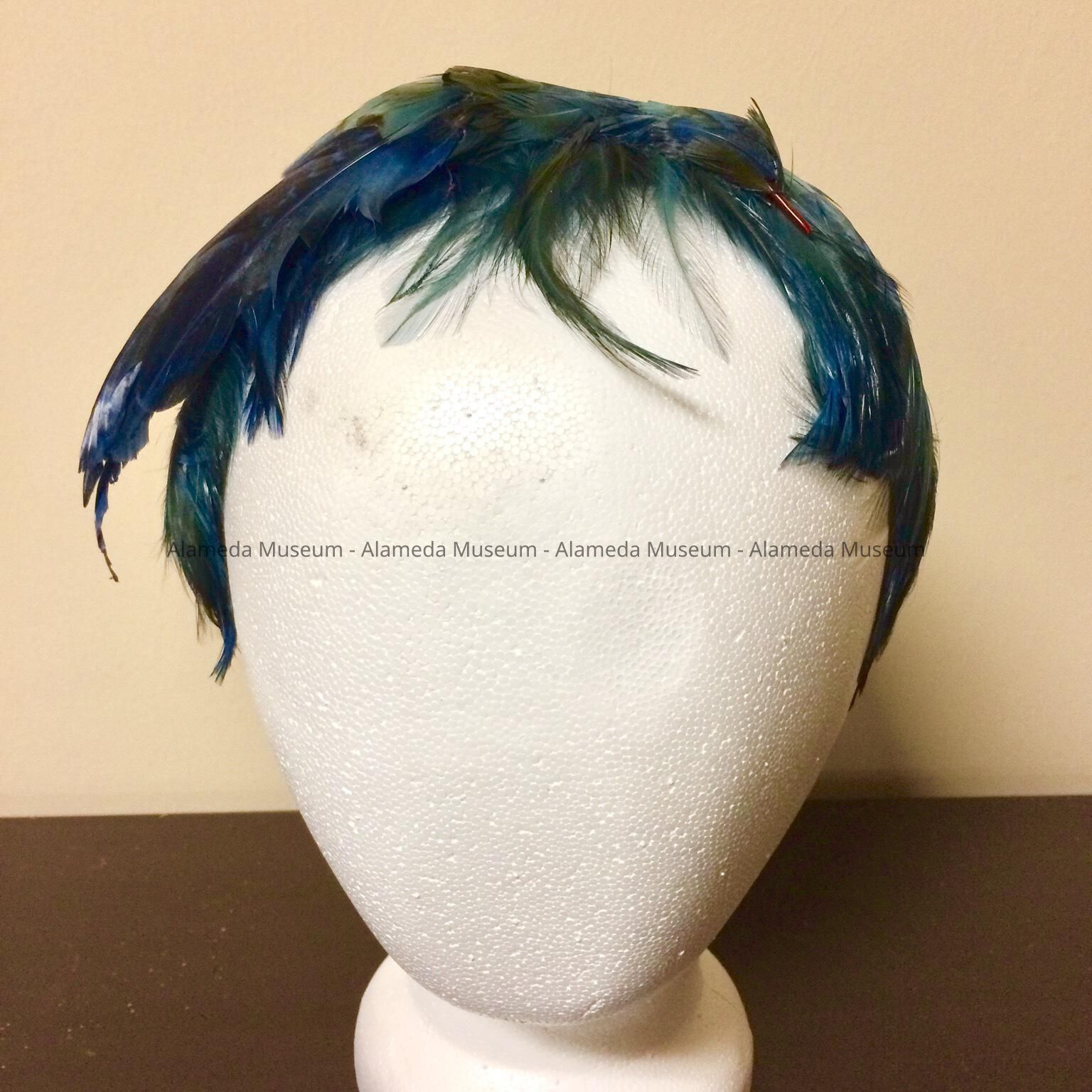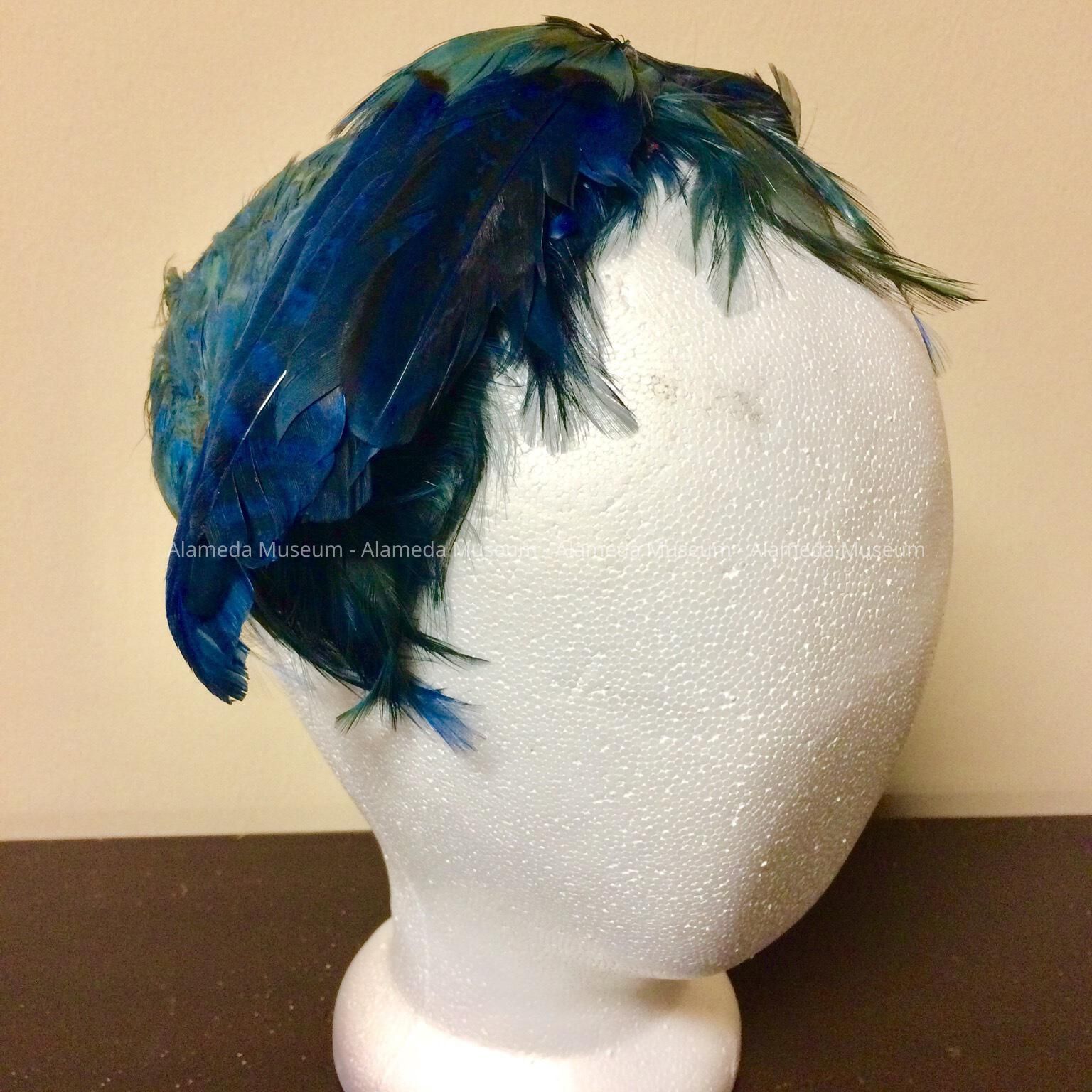 Cocktail hat of dark blue velvet with peacock blue feathers and partial bird, c. 1950sEntry/Object ID