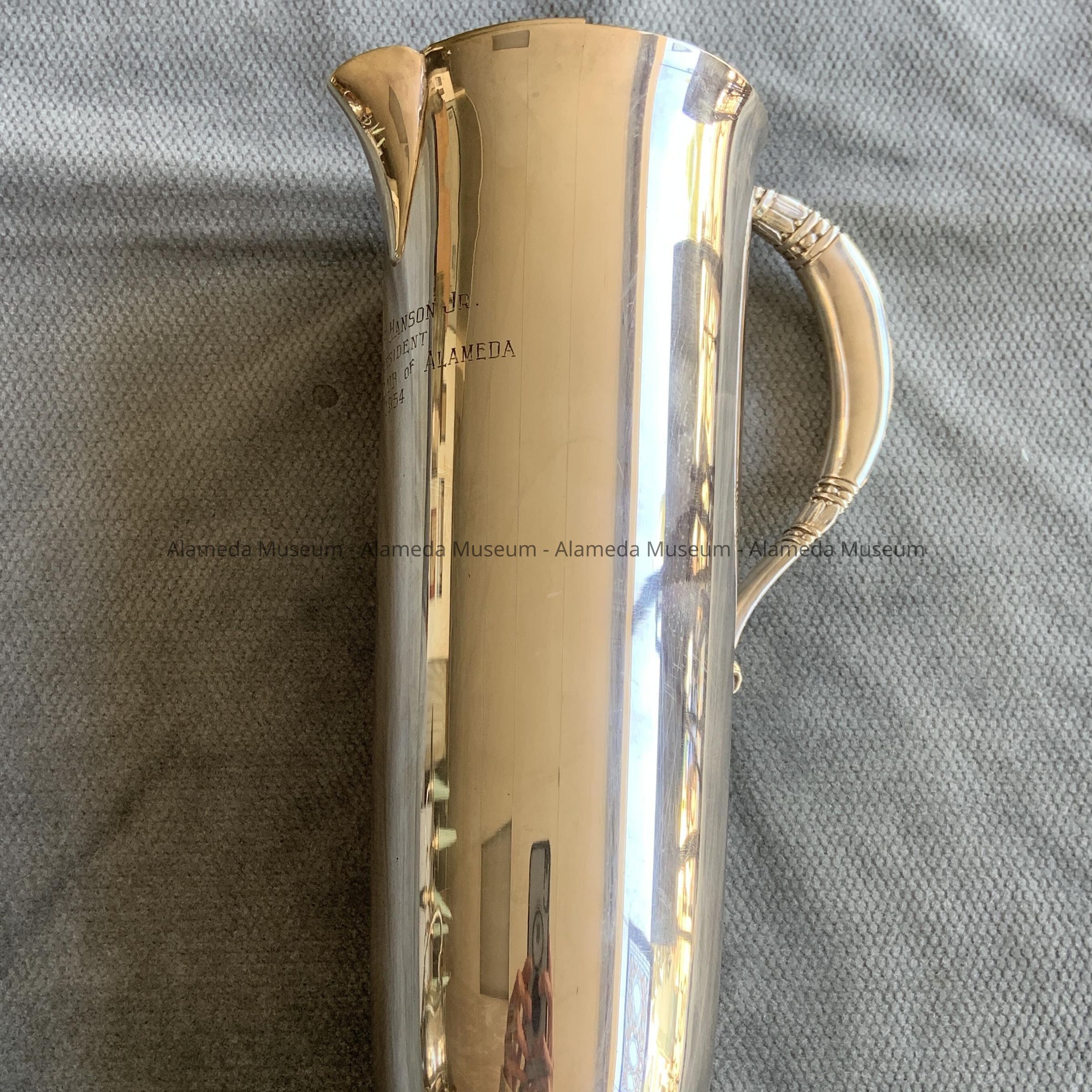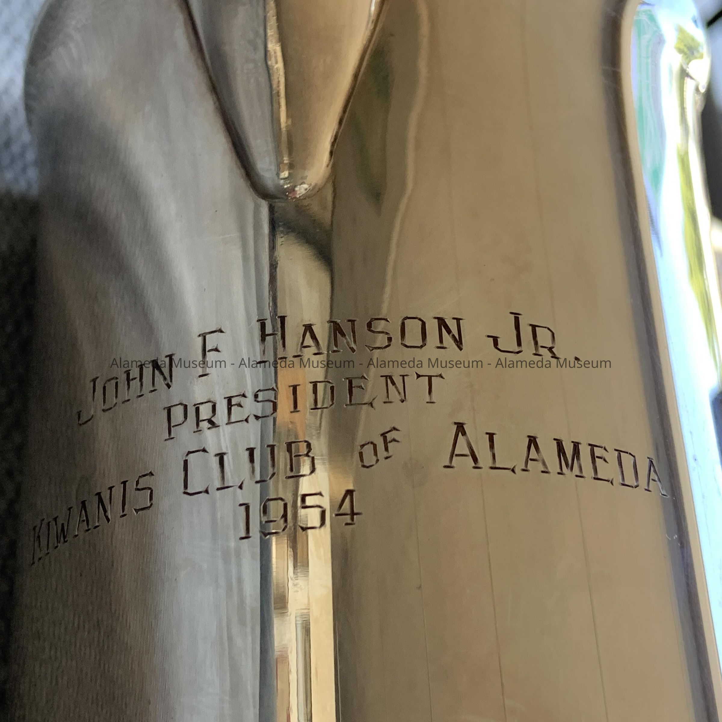 Silver plated cocktail pitcher presented to John F. Hanson, Jr., then president of the Kiwanis Club of Alameda, 1954. Mr. Hanson is a descendant of an early-Alameda family who came here in 1875.