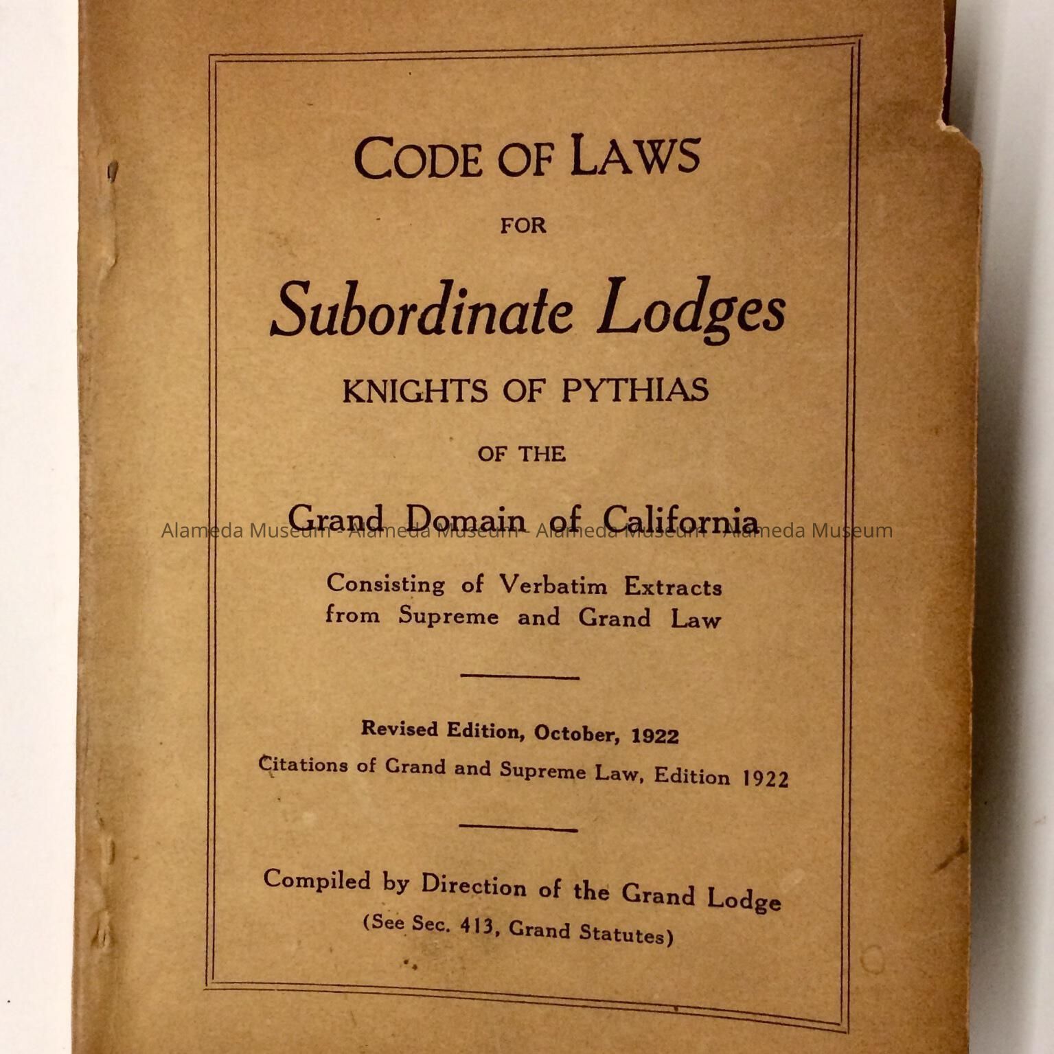Description: Booklet with caption: 'Code of Laws for Subordinate Lodges, Knights of Pythias of the Grand Domain of California' and dated October, 1922. Some pages have the corners folded in.