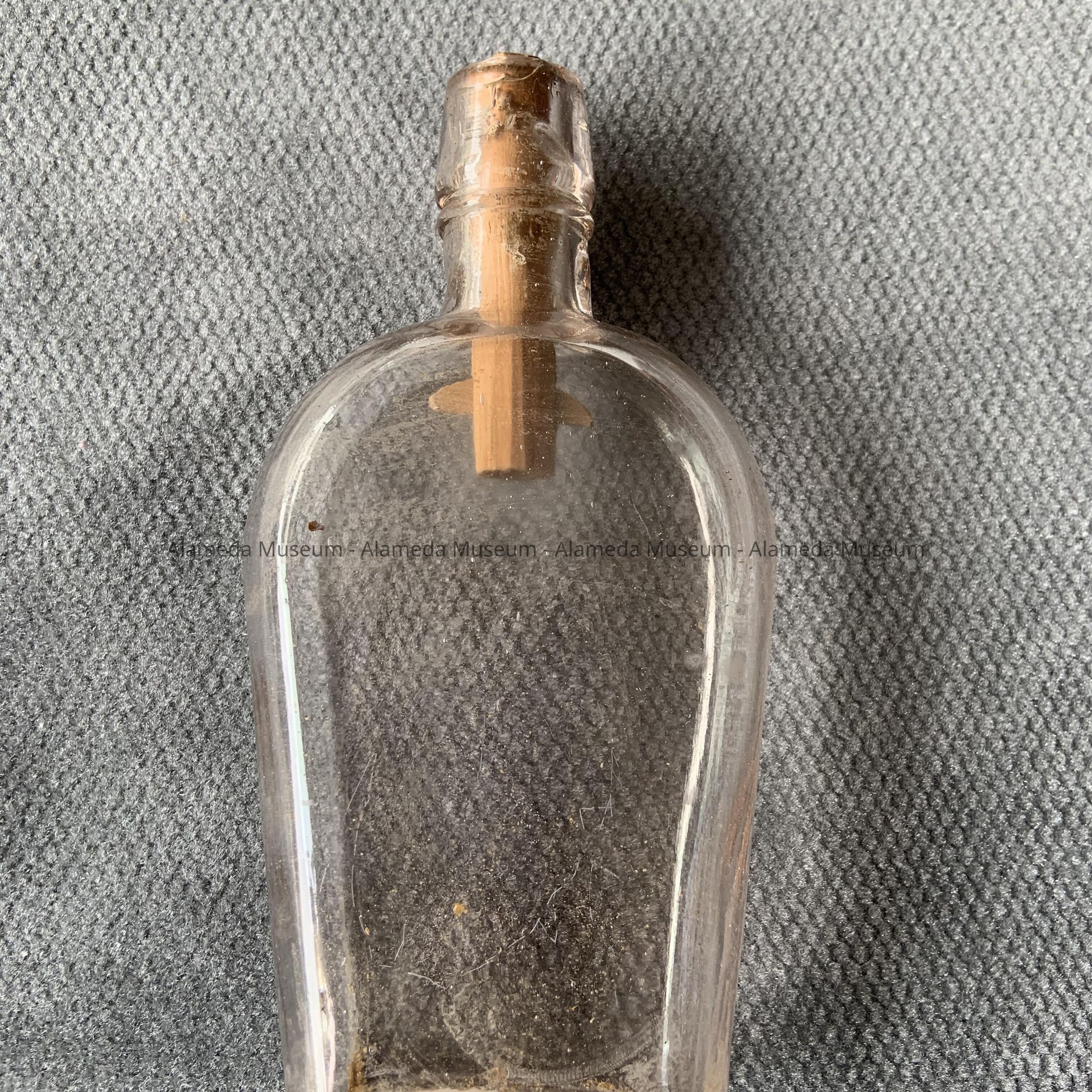 Description: A coffin-shaped double seamed clear glass bottle. The lip of the bottle has the original cork. It appears to be of American manufacture.