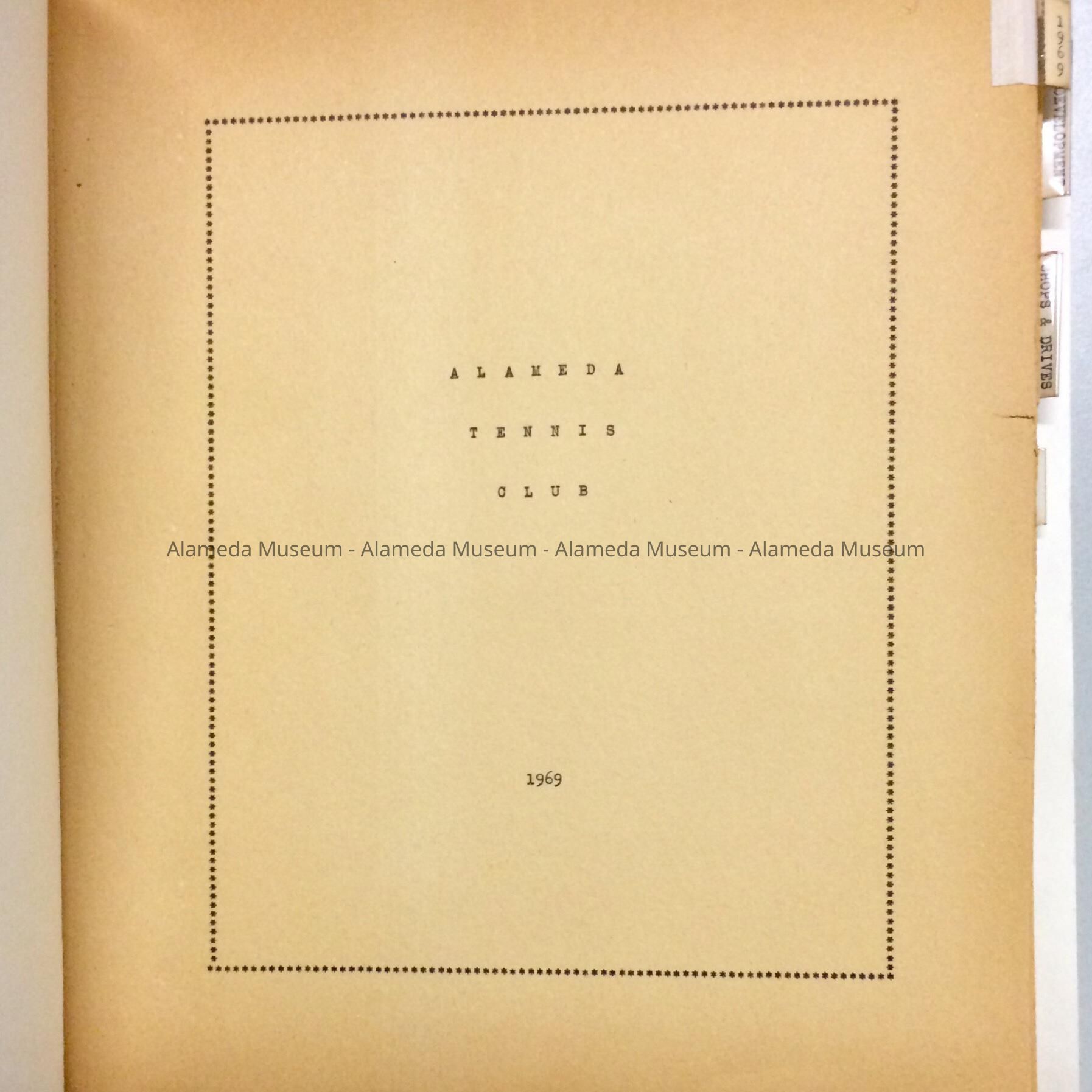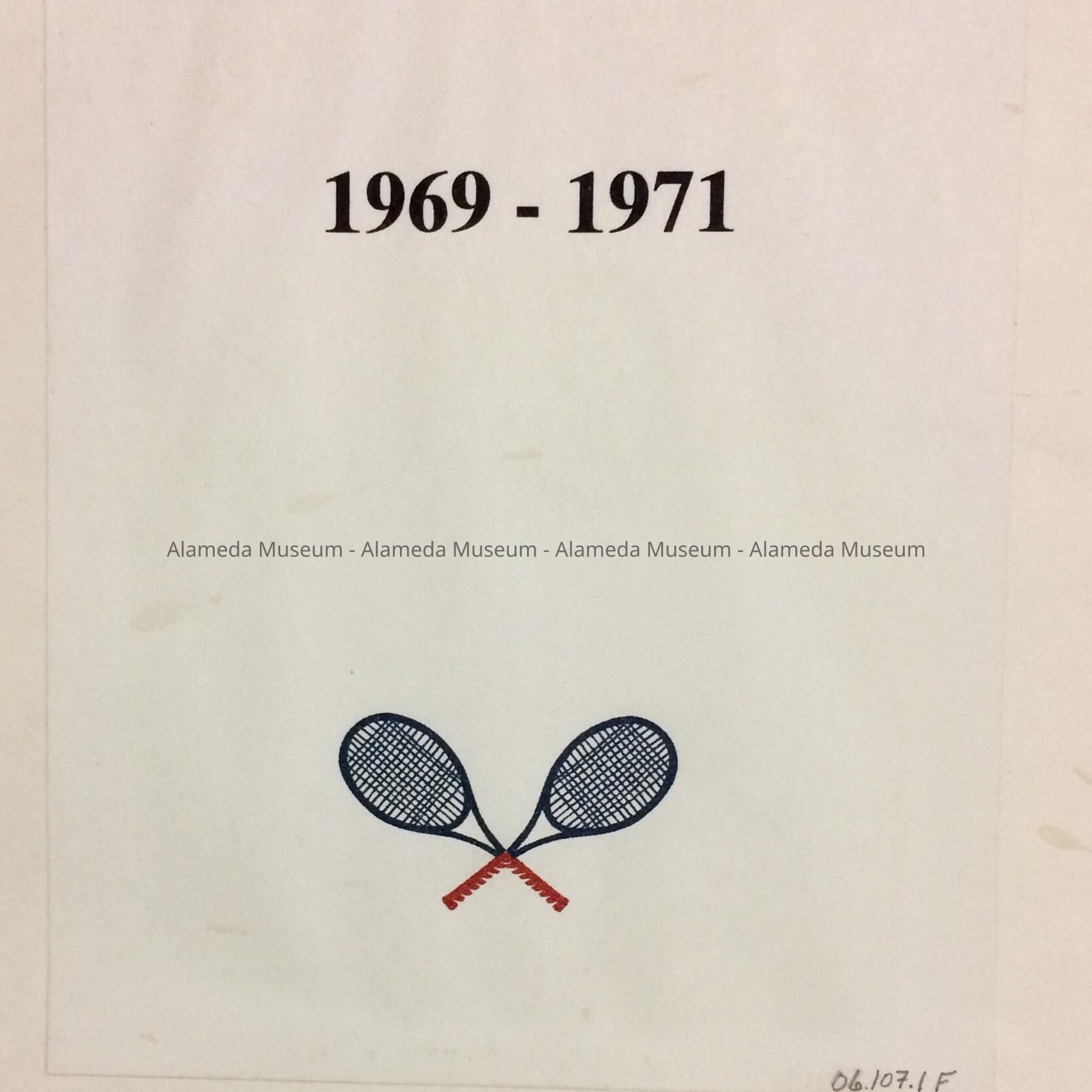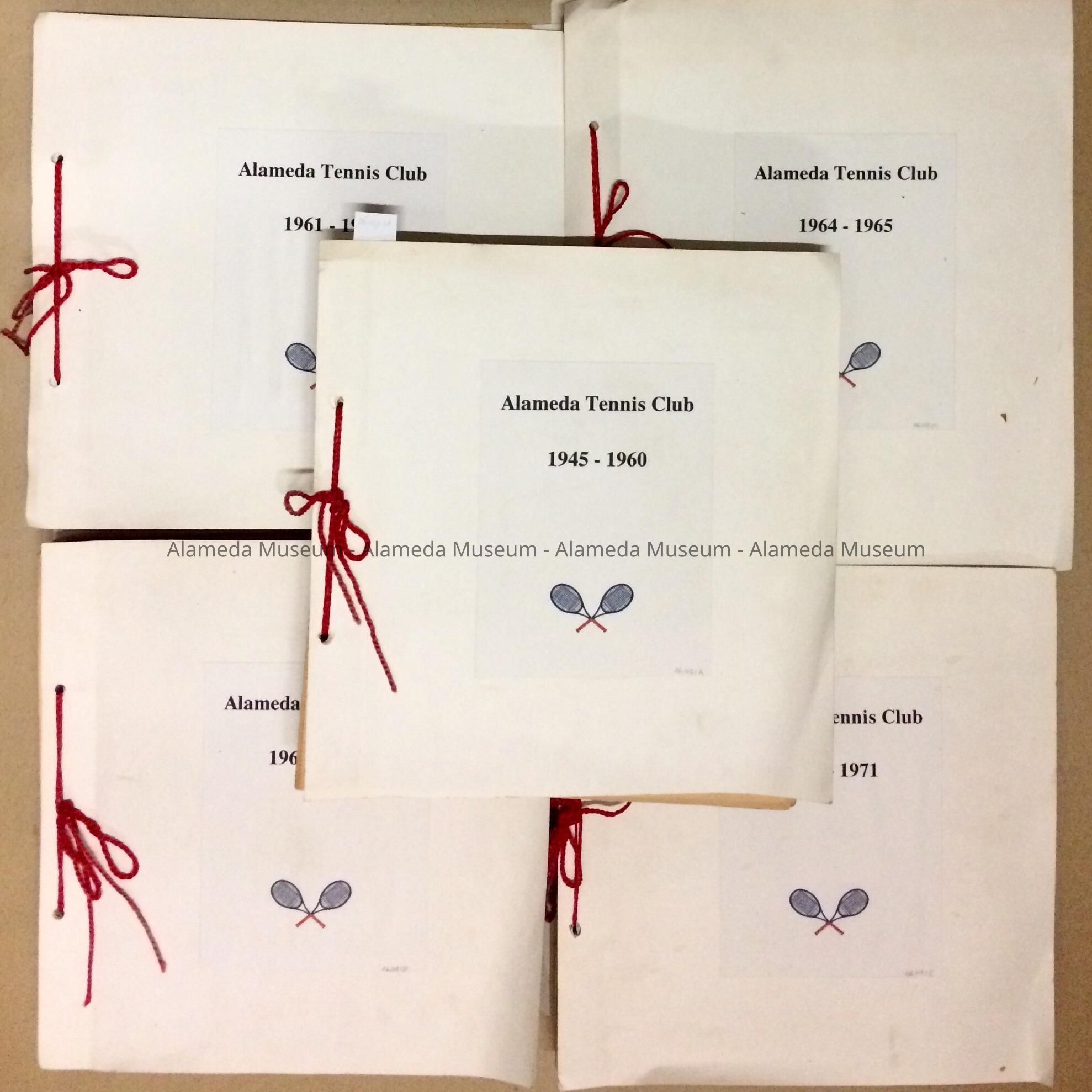 DESCRIPTION: LOOSE-LEAF SCRAPBOOKS WITH WHITE-COLORED HEAVY STOCK PAPER COVERS. COVERS AND PAGES ARE SECURED WITH RED COLORED STRING. EACH SCRAP BOOK HAS ON ITS COVER A PRINTED PAPER LABEL STATING, "ALAMEDA TENNIS CLUB." A: 1945-1960; B: 1961-1963; C: 1964-1965; D: 1966-1968; E: 1969-1971