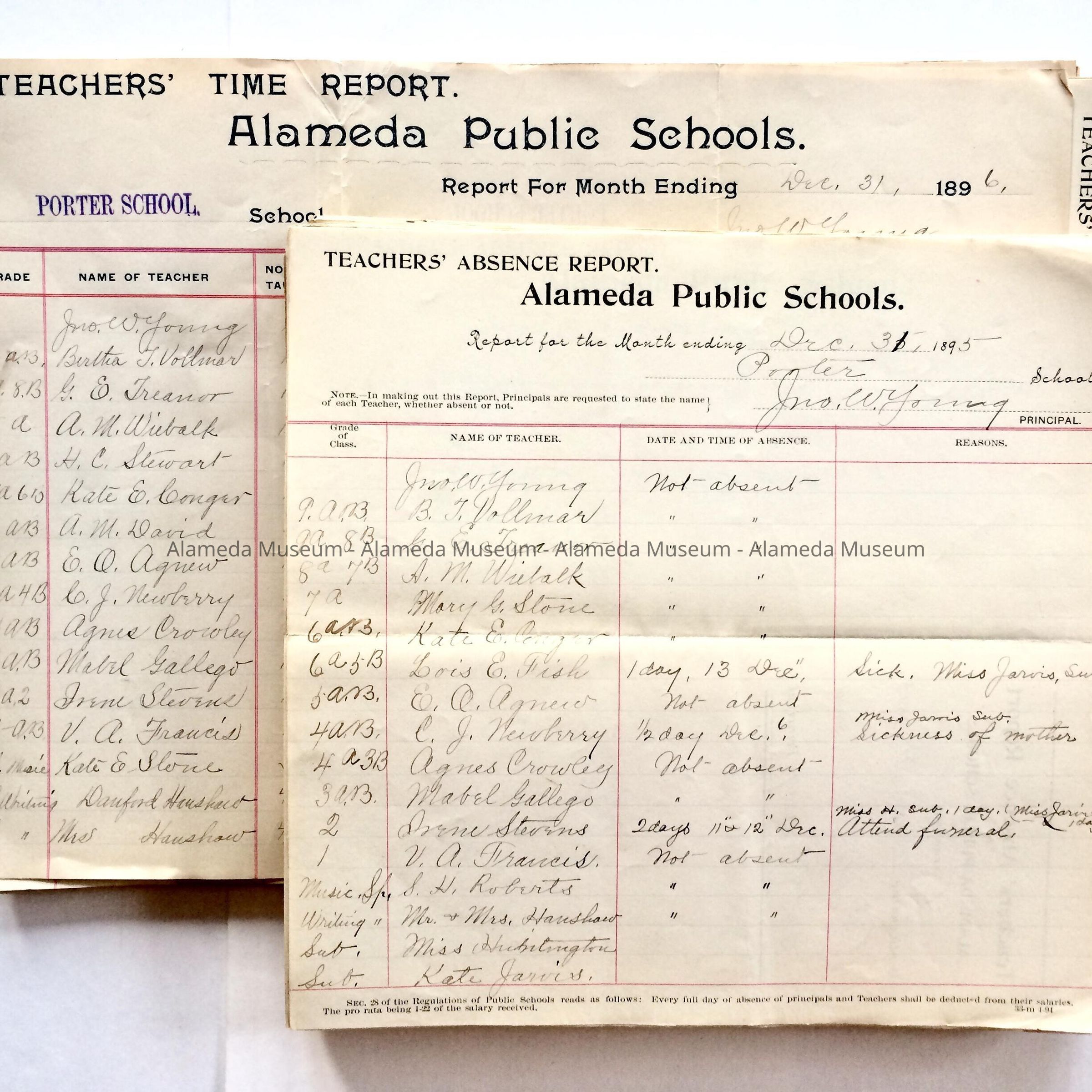 Collection of forms, in 2 styles, with handwritten information filling in blanks and columns in printed text. All reports state 'Alameda Public Schools'. Forms of the larger style (2) are dated either October 1896, or December 1896, and appear to originally have been folded in 3, and on one side, state at the top: 'Teachers' Time Report'. The reverse has either handwritten information or a stamped school name. Forms of the smaller, more numerous style (1) would have been folded in two, and state 'Teachers' Absence Report'. Style 1 forms date from between January 1895 and December 1896.
