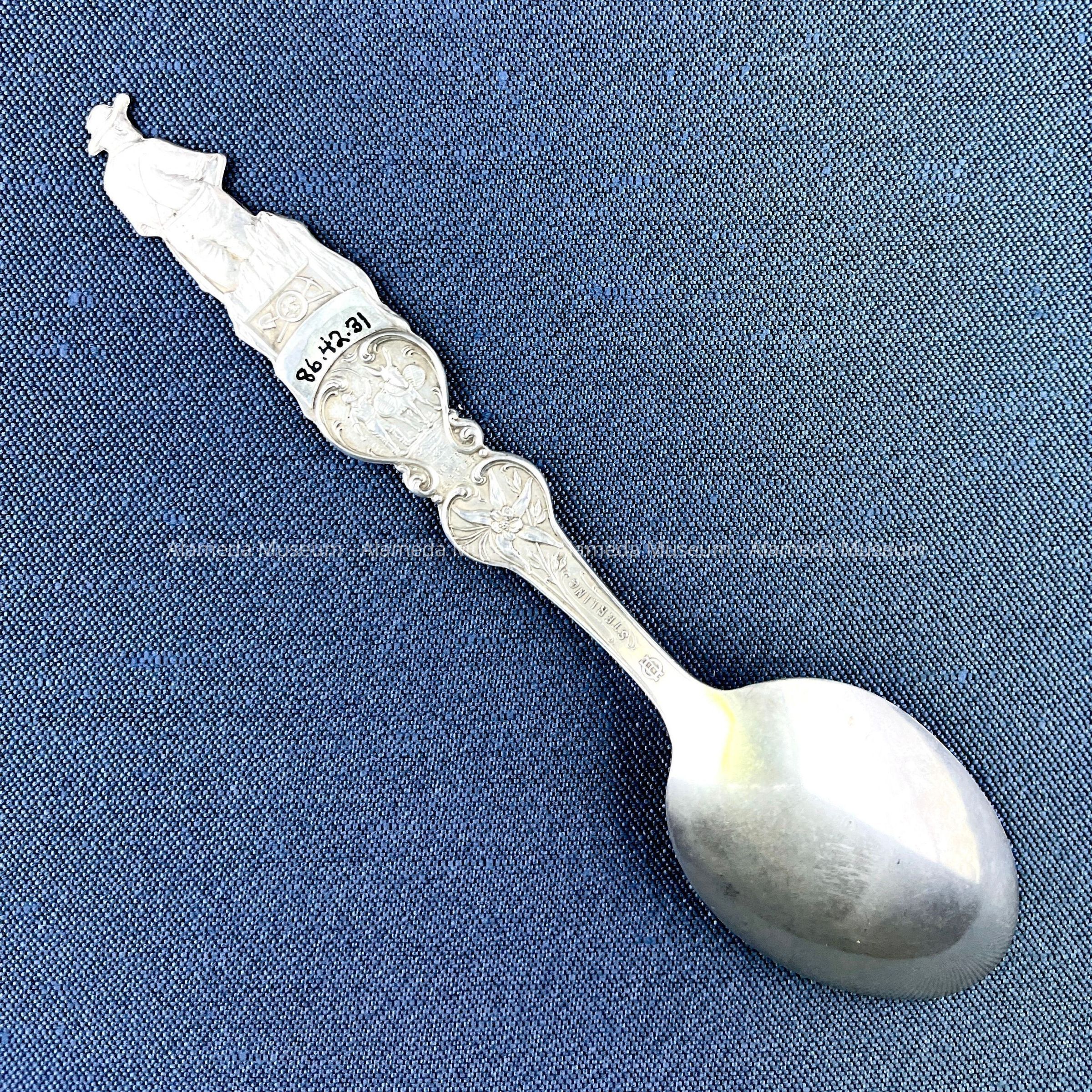 Description: Sterling silver teaspoon, signed "H.0." Engraved scene in bowl representing the State Capital building, Denver, Colorado. Figural handle (gold miner) and state seal are used as decorative motifs.