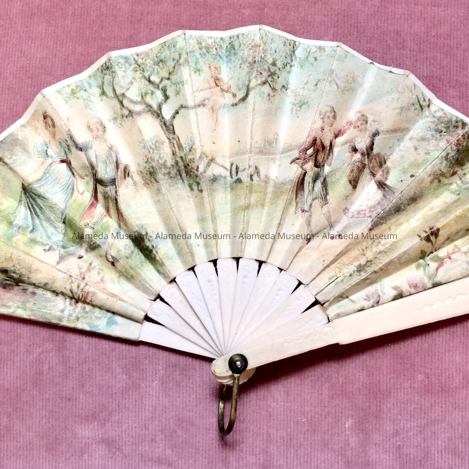 Description: Colored lithograph paper (depicting 18th century attired dancers) covered fan with ivory or bone stays (incised carving).