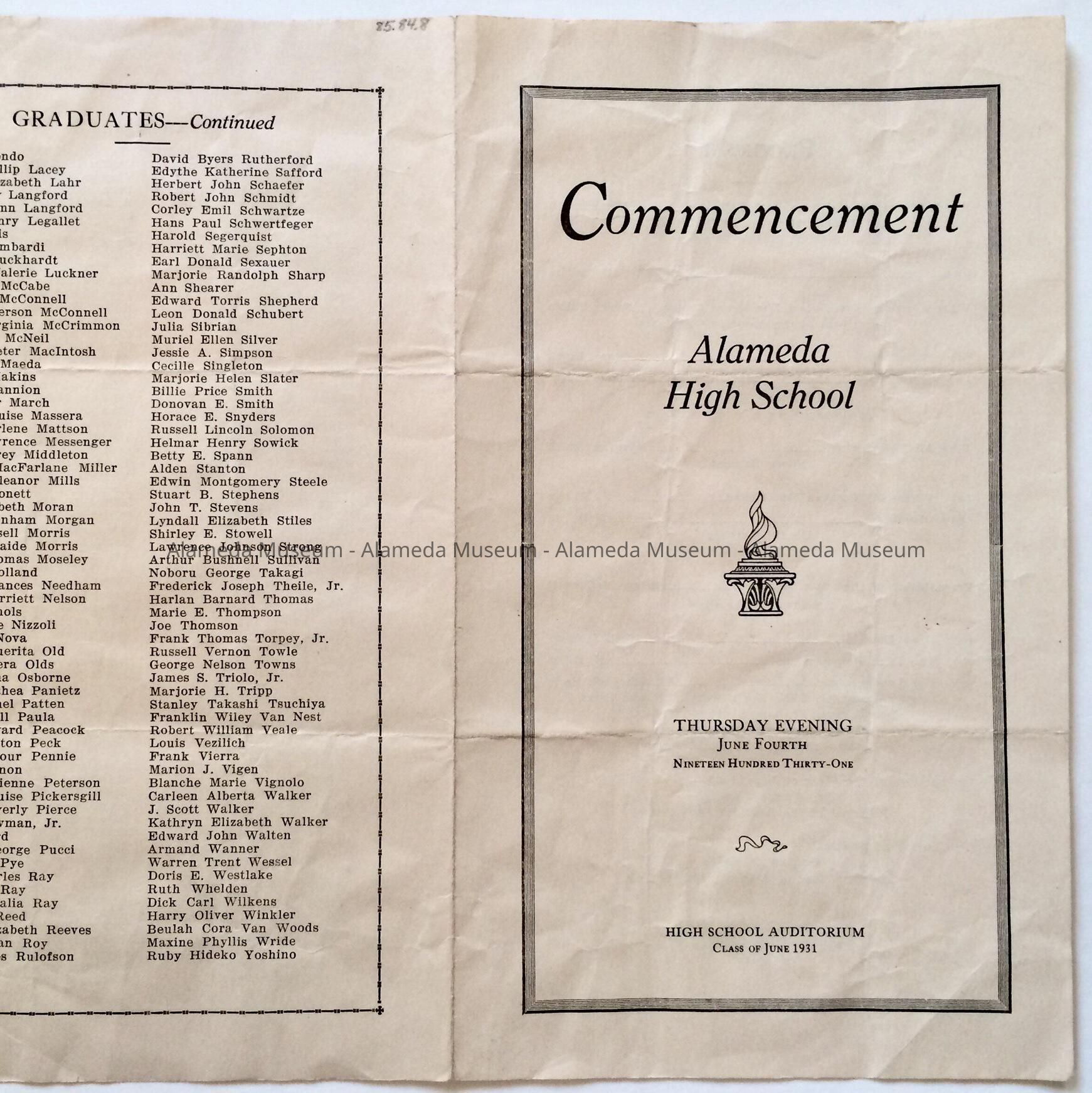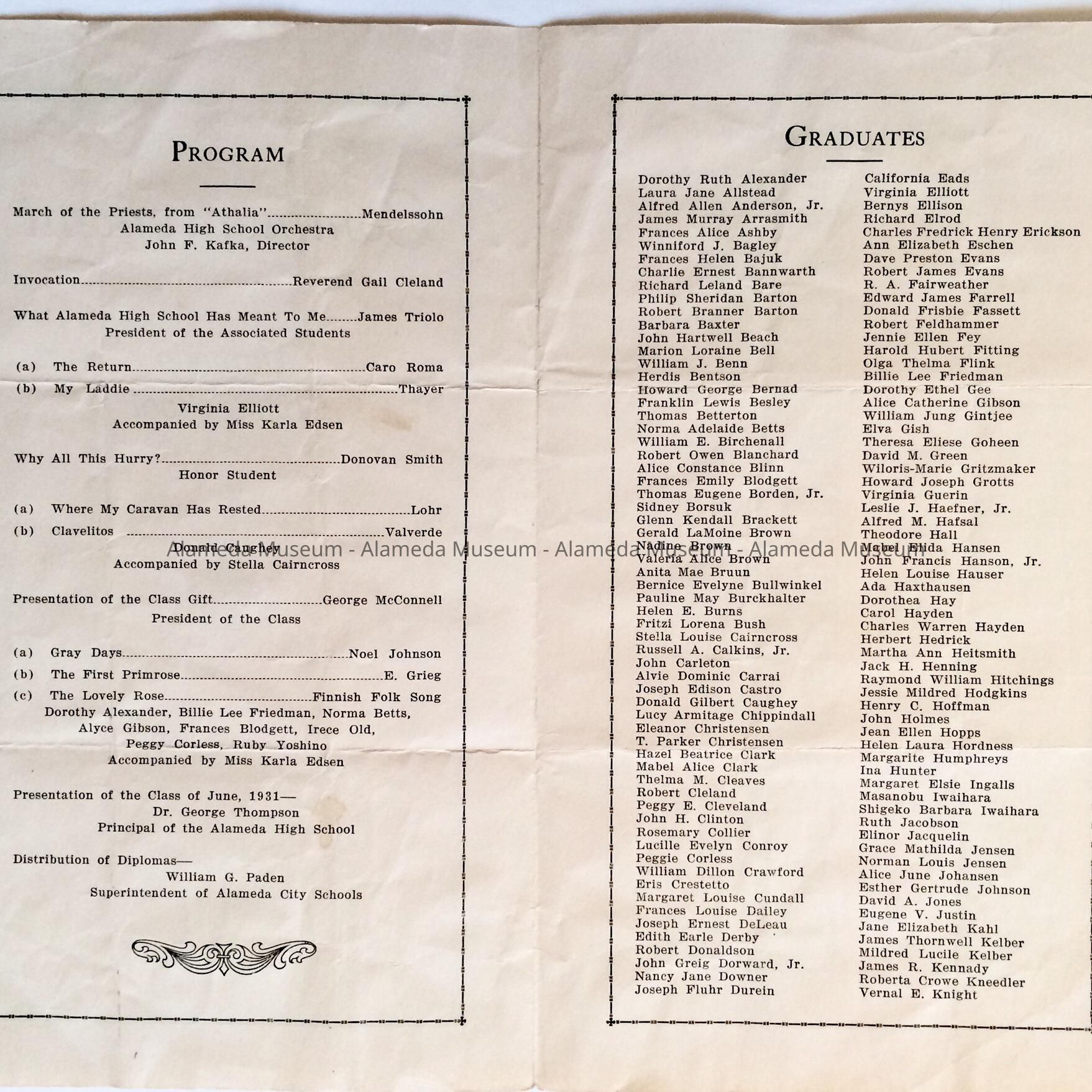 Commencement Program Alameda High School, June 1931Entry/Object ID