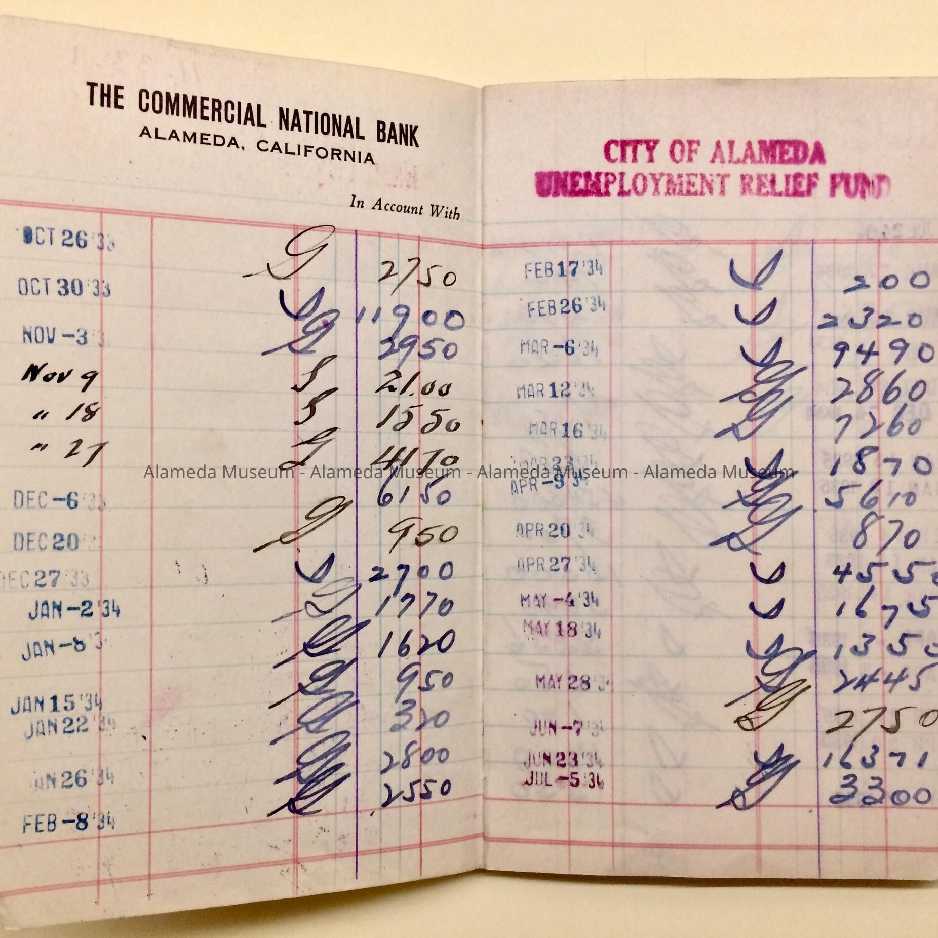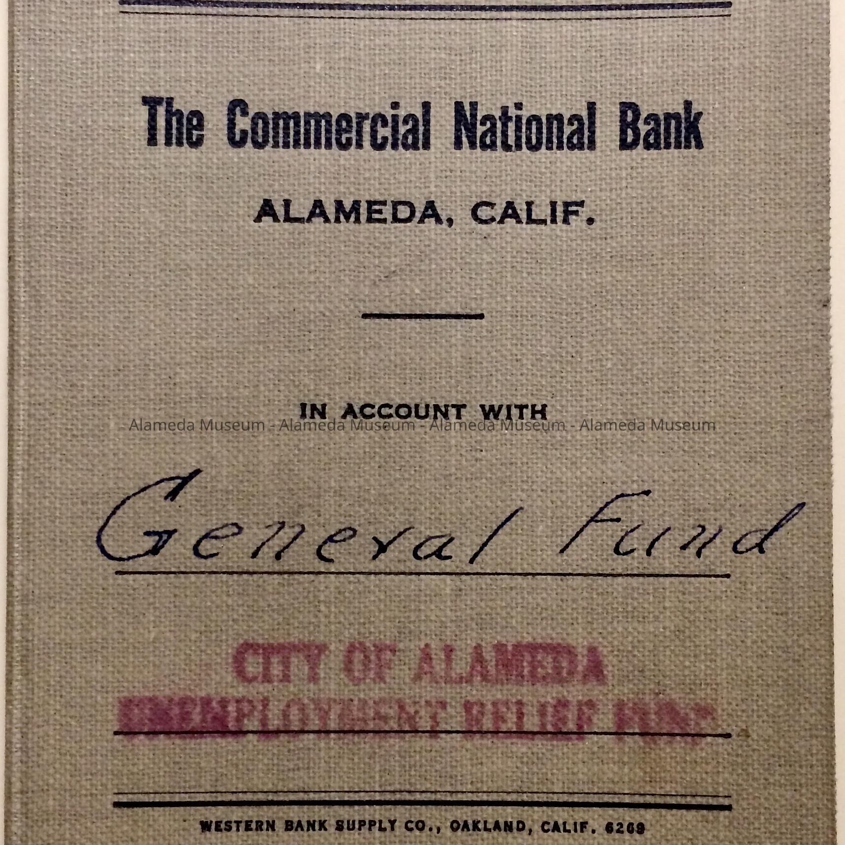 Description: Bank Account Book from "The Commercial National Bank, Alameda, Calif”. Additionally, it has printed “In Account with”, and, filled in on the next line, by hand “General Fund”, and stamped in red ink: “City of Alameda Unemployment Relief Fund’. On the top of the cover has been added by hand: No. 2. contains 3 and a half pages of entries, starting with Oct 26, 1933; the last entry was Sep 24, 1935.