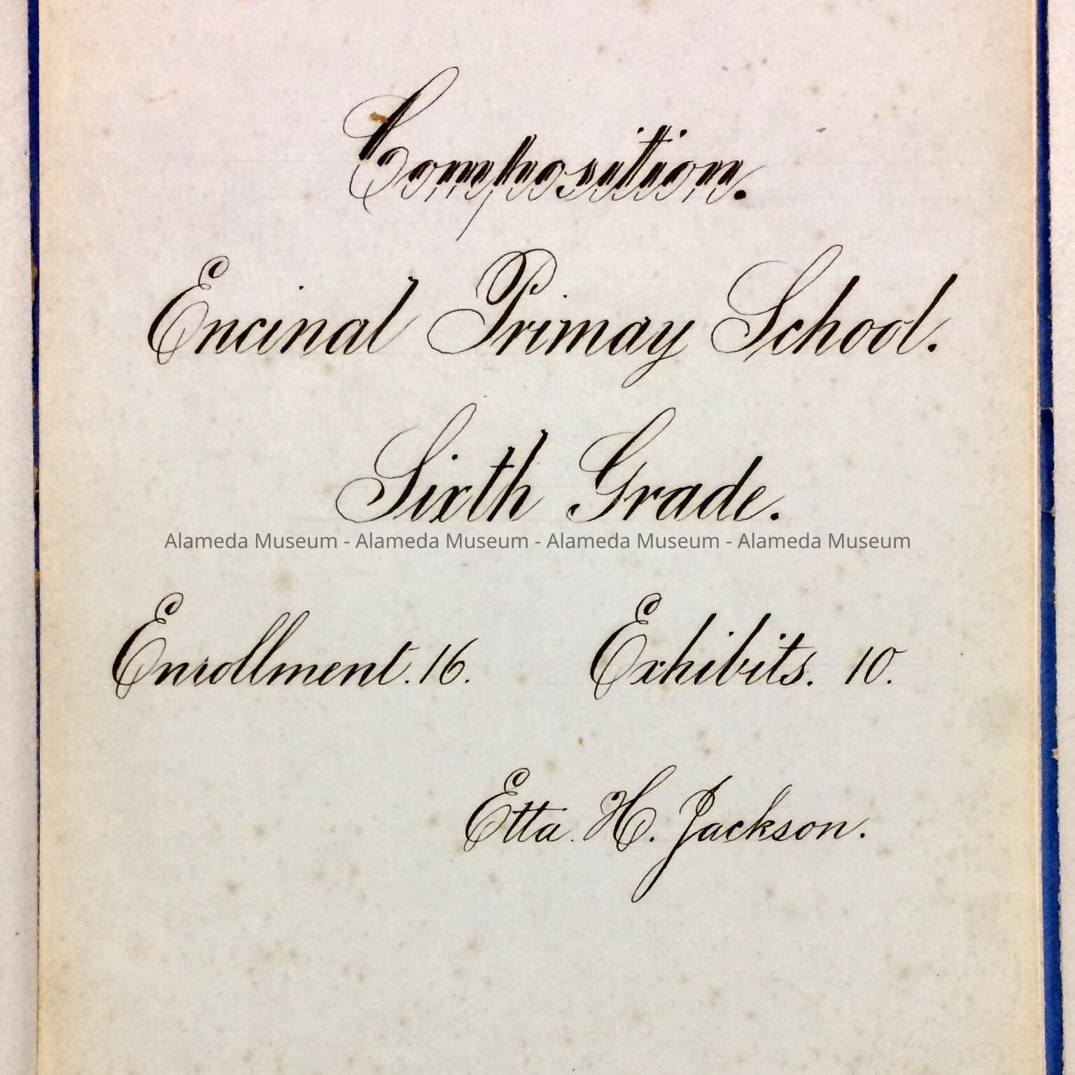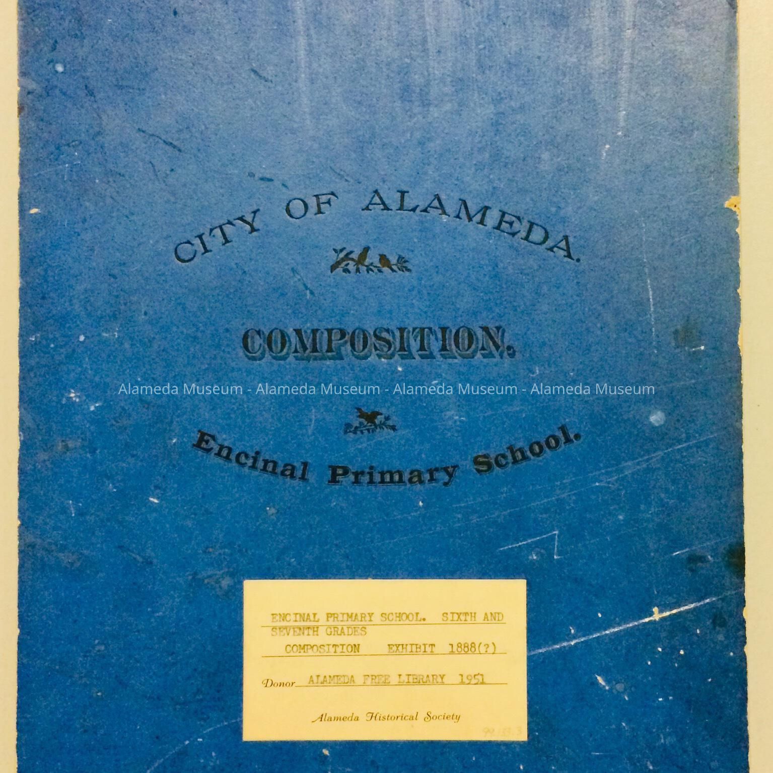 Description: Loose leaf booklets with cover of blue colored cardboard. Cover has caption "City of Alameda - Compositions Encinal Primary School" in black colored type.