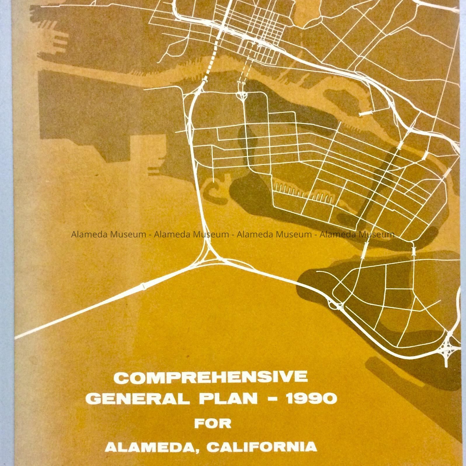 ILLUSTRATED SOFT-COVER REPORT. COVER HAS A DECORATIVE DESIGN OF AN AERIAL VIEW OF ALAMEDA PROPER AND BAY FARM ISLAND. BOLD-PRINTED CAPTION, "COMPREHENSIVE GENERAL PLAN, 1990," IN WHITE-COLORED TYPE ON A GOLD-COLORED BACKGROUND.