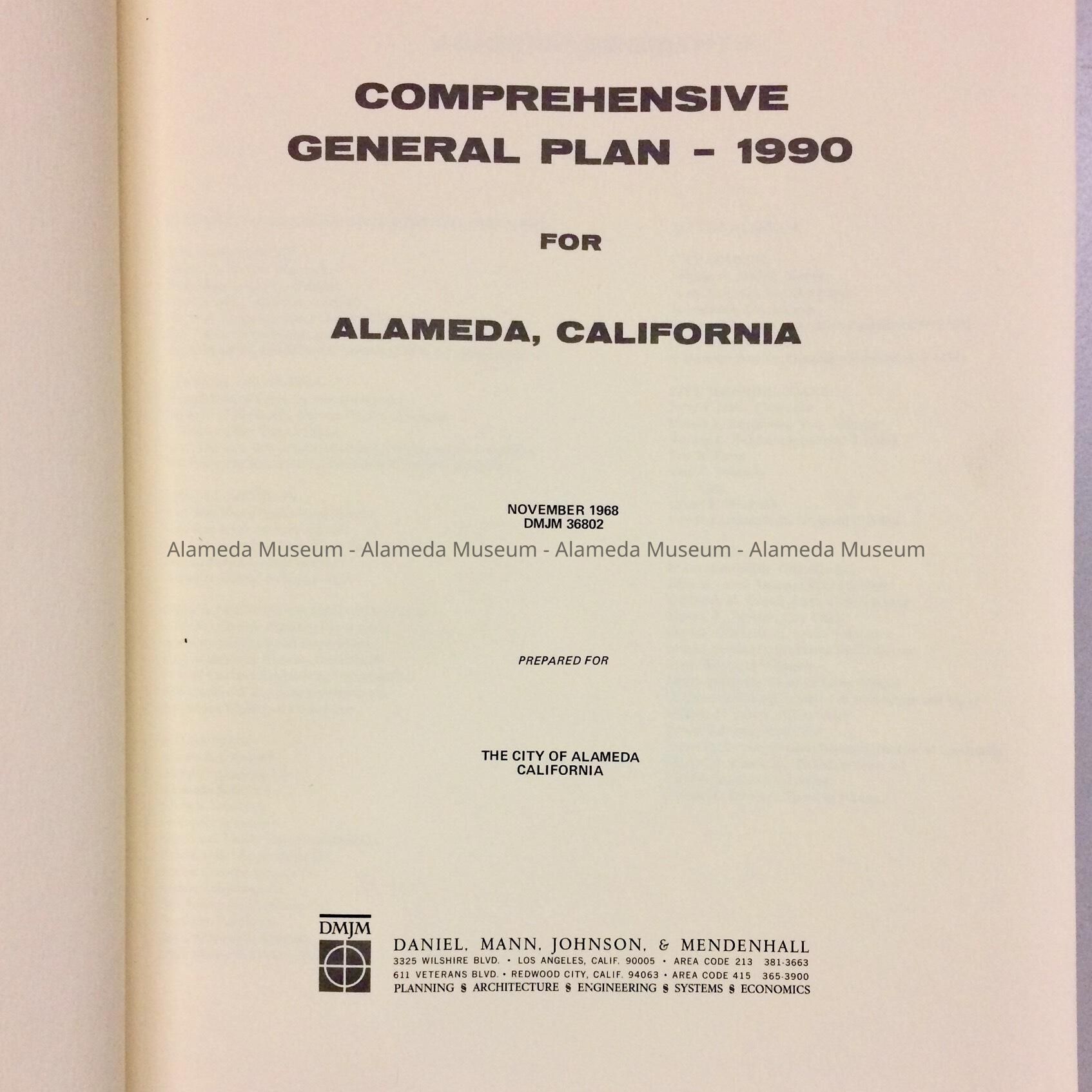 SOFT-BOUND COPY, "COMPREHENSIVE GENERAL PLAN, 1990," FOR THE CITY OF ALAMEDA, CALIFORNIA. COMPILED BY DANIEL, MANN, JOHNSON, AND MENDENHALL, ARCHITECTS. SUBMITTED IN NOVEMBER, 1968. REPORT CONTAINS AN ELABORATE PLAN FOR PARK STREET, ETC.; HOWEVER, THOSE PLANS HAVE NOT BEEN IMPLEMENTED.