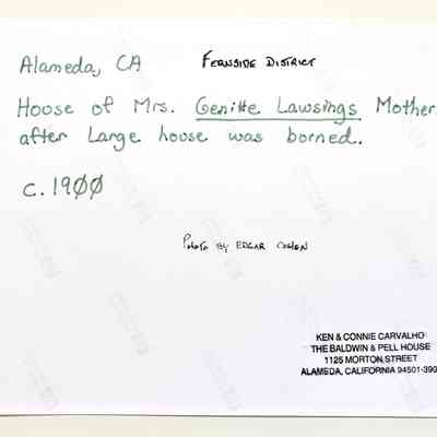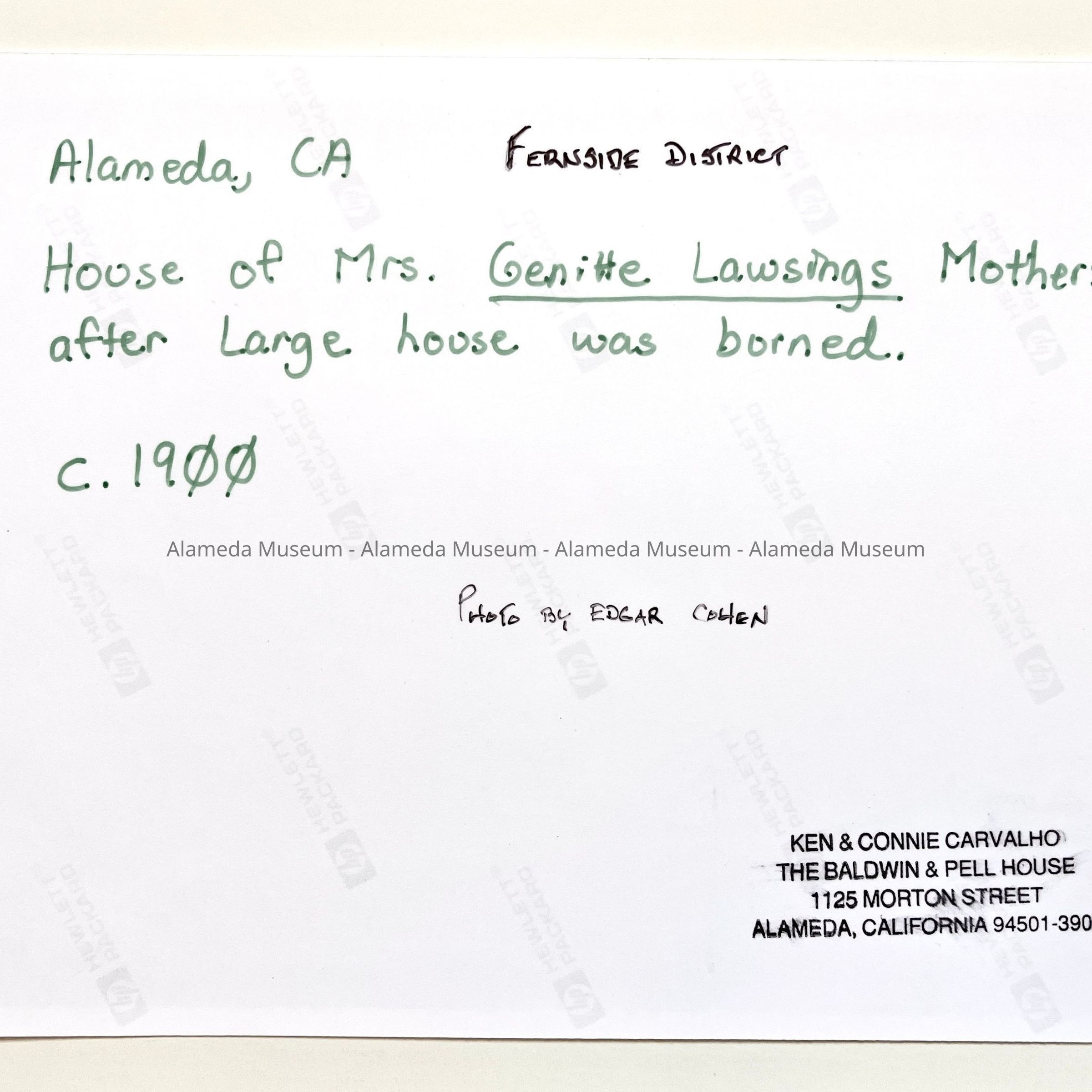 A COMPUTER-GENERATED PHOTOGRAPH FROM THE ORIGINAL. THE ORIGINAL PHOTOGRAPH BORE THE FOLLOWING CAPTION: "ALAMEDA, CAL., HOUSE OF MRS G LAWSINGS' MOTHER AFTER LARGE HOUSE WAS BURNED." NAME BELIEVED TO BE LANSING, AND THE MOTHER IN QUESTION WAS MRS A A COHEN. THE ORIGINAL PHOTOGRAPH WAS SIGNED, "EDGAR COHEN, SON OF A A COHEN.".