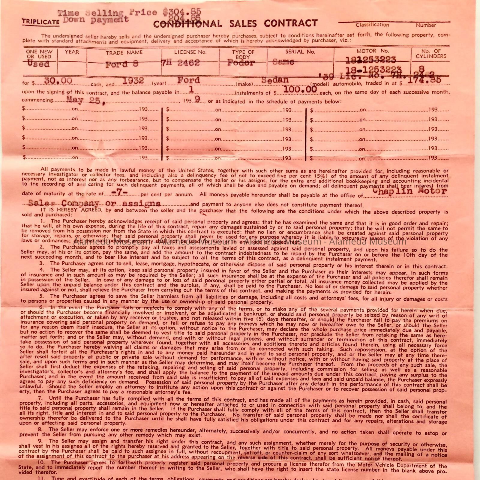 'Conditional Sales Contract' from Chaplin Motor Sales Company, 1939Entry/Object ID