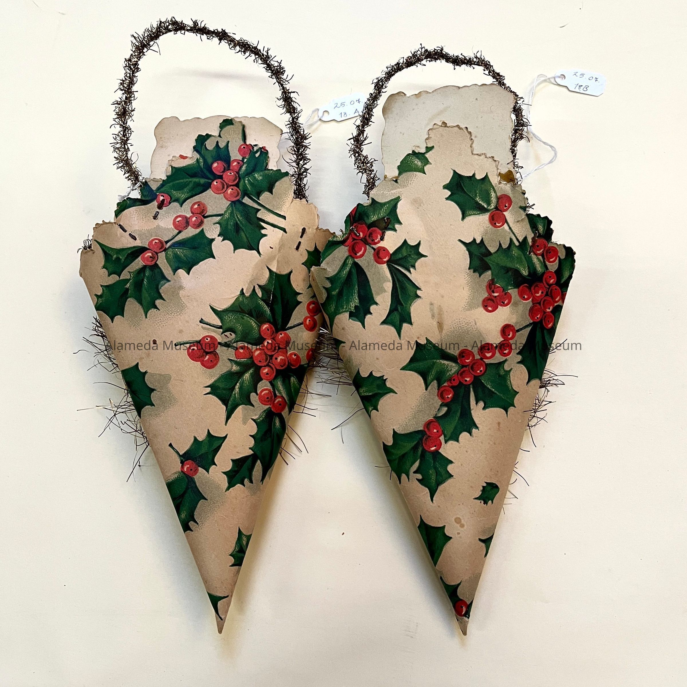 Description: Made of paper and tinsel, these were possibly put onto the Christmas tree or other parts of the home. They are identical in motifs and tinsel.