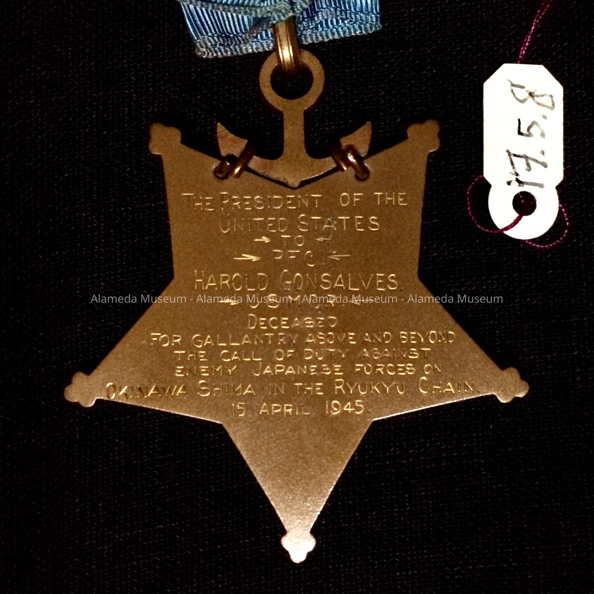 History of Object: The Congressional Medal of Honor Medal awarded posthumously to USMC Pfc. Harold Gonsalves of Alameda.
