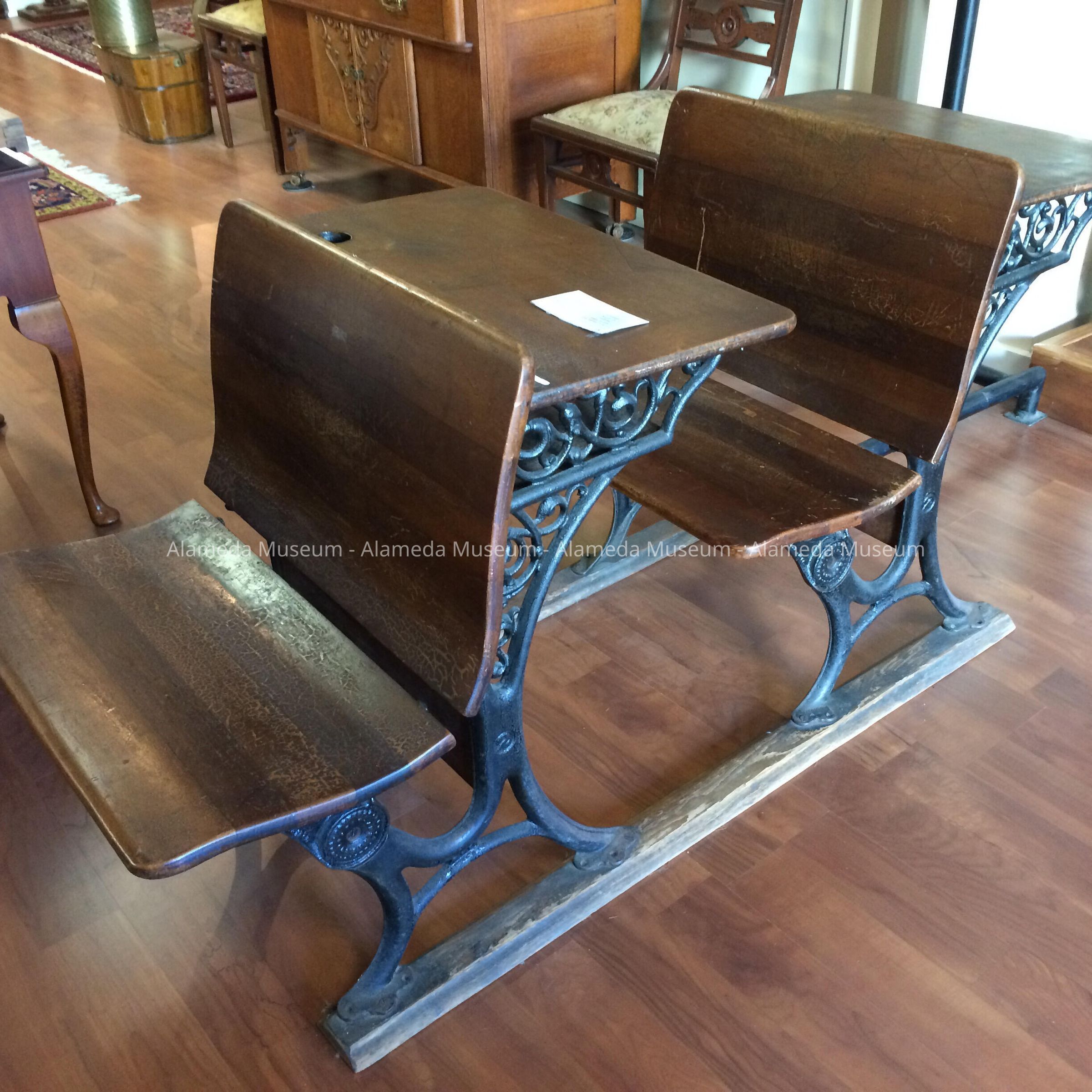 TWO SCHOOL DESKS MOUNTED ON WOODEN PLANKS. DESK TOPS REST ON ORNATE CAST IRON BRACKETS WHICH ALSO SERVE AS ATTACHMENTS FOR THE SEATS. IRON BRACKETS, BESIDES SUPPORTING THE DESK TOPS, FORM OPENINGS FOR THE STORAGE OF PAPER, PENCILS, AND BOOKS. BOTH TOPS HAVE CIRCULAR-SHAPED OPENINGS FOR HOLDING INK WELLS. TOPS ALSO HAVE ROUTED INSET SECTIONS FOR STORAGE OF BOOKS AND PENCILS. LOCATED UNDER EACH SEAT IS A CAPTION IN BLACK-COLORED INK STATING "ALAMEDA UNIFIED SCHOOL DISTRICT." DESKS HAVE ORIGINAL VARNISH FINISHES AS THE ORIGINAL FINISH.