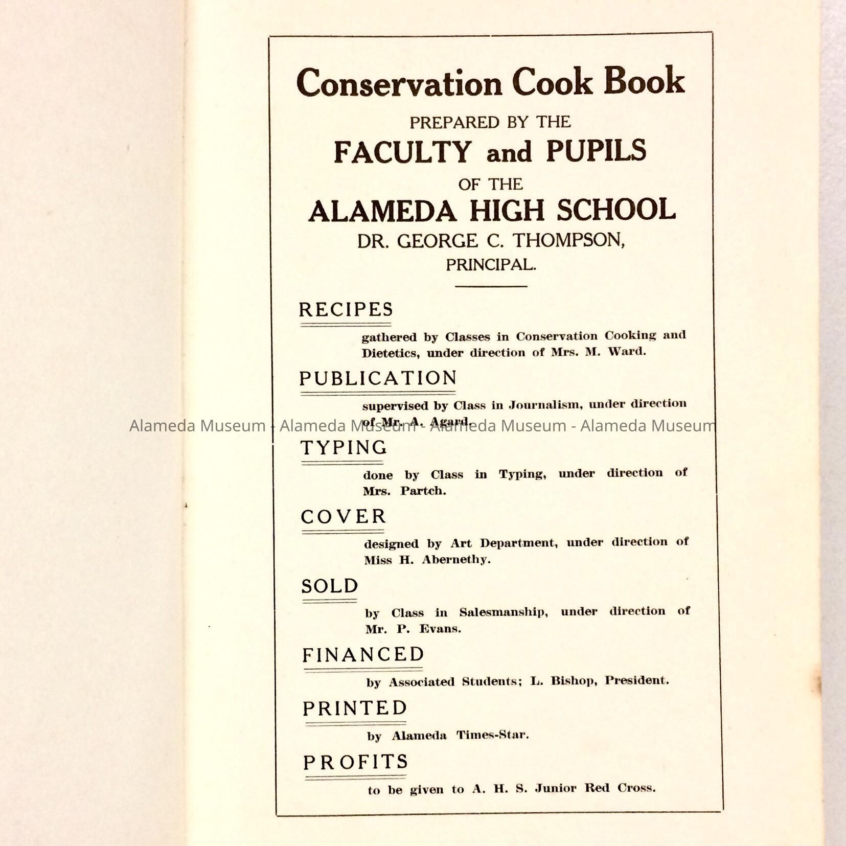 Copy of the "Conservation Cook Book" prepared by the faculty & pupils of the Alameda High School, 1918.