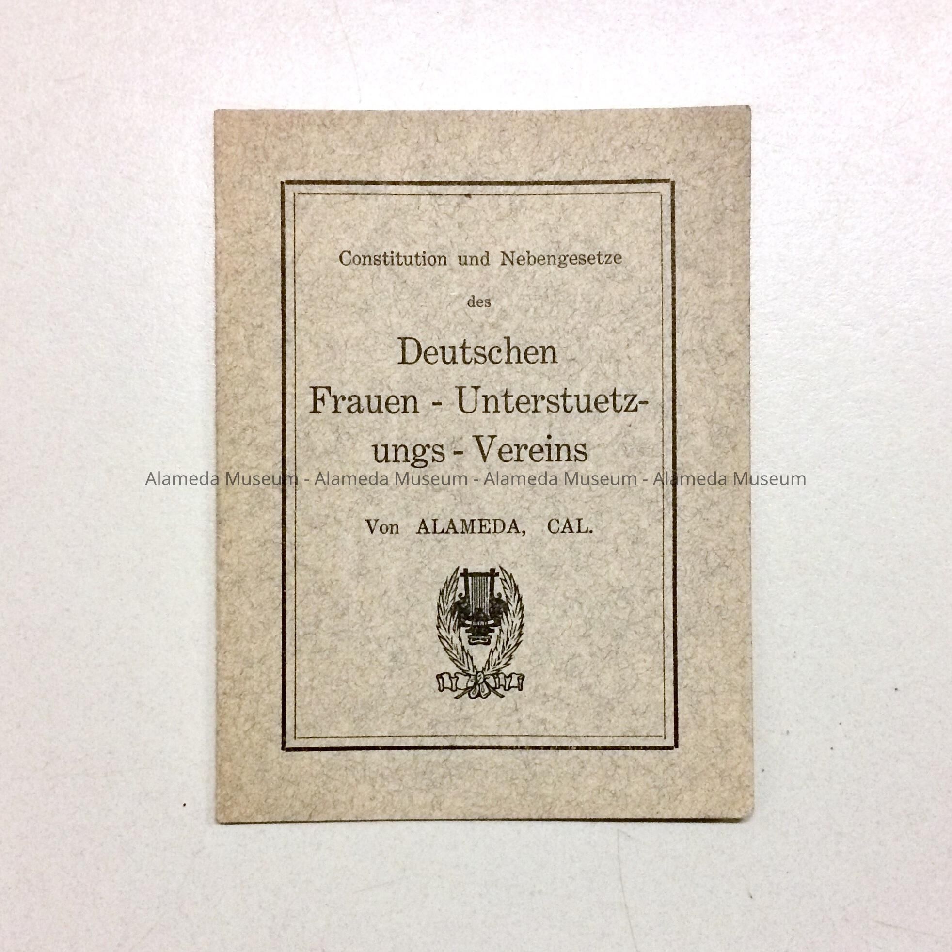 SOFT-BOUND BOOKLET, WITH COVER OF GREY-COLORED PAPER. PRINTED CAPTION IN BLACK-COLORED TYPE (IN GERMAN): CONSTITUTION UND NEBENGESETZE DES DEUTSCHEN FRAUEN- UNTERSTUETZUNGS - VEREINS VON ALAMEDA CAL.