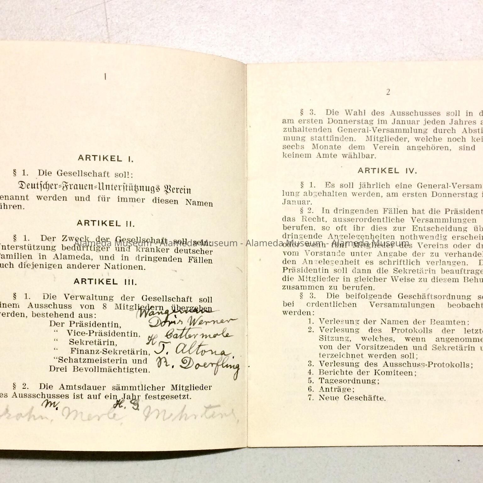 Constitution and By-Laws of the German Ladies' / Alameda Ladies' Relief Society, before 1925Entry/Object ID