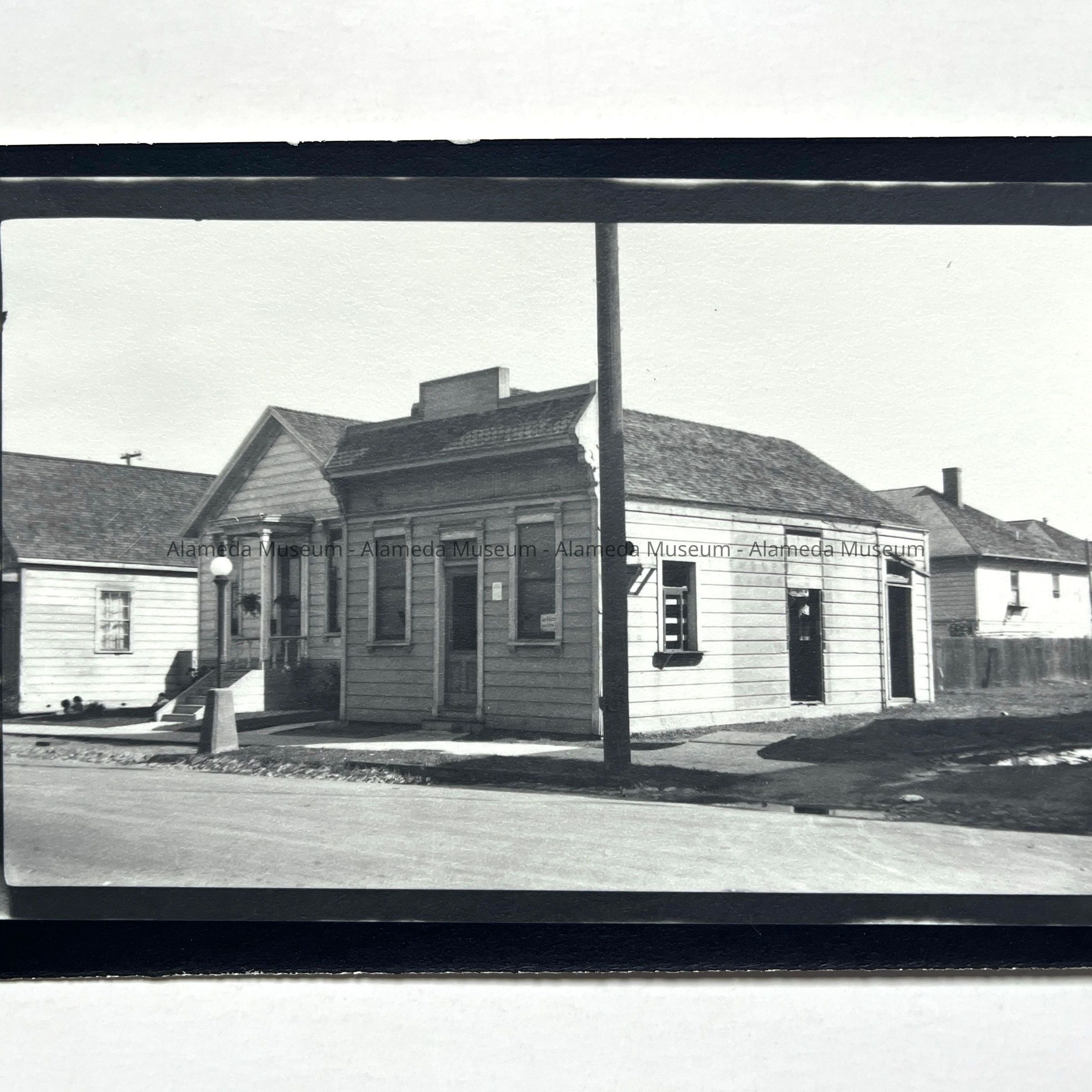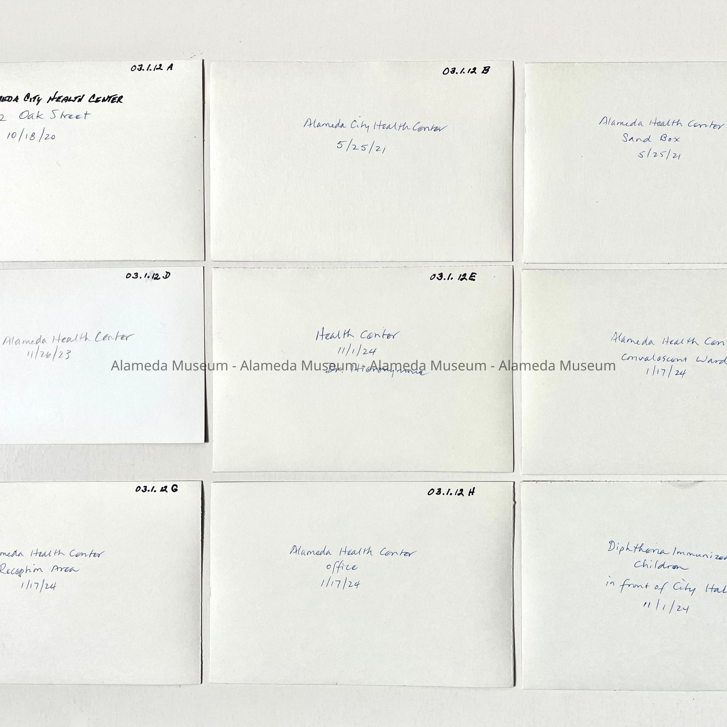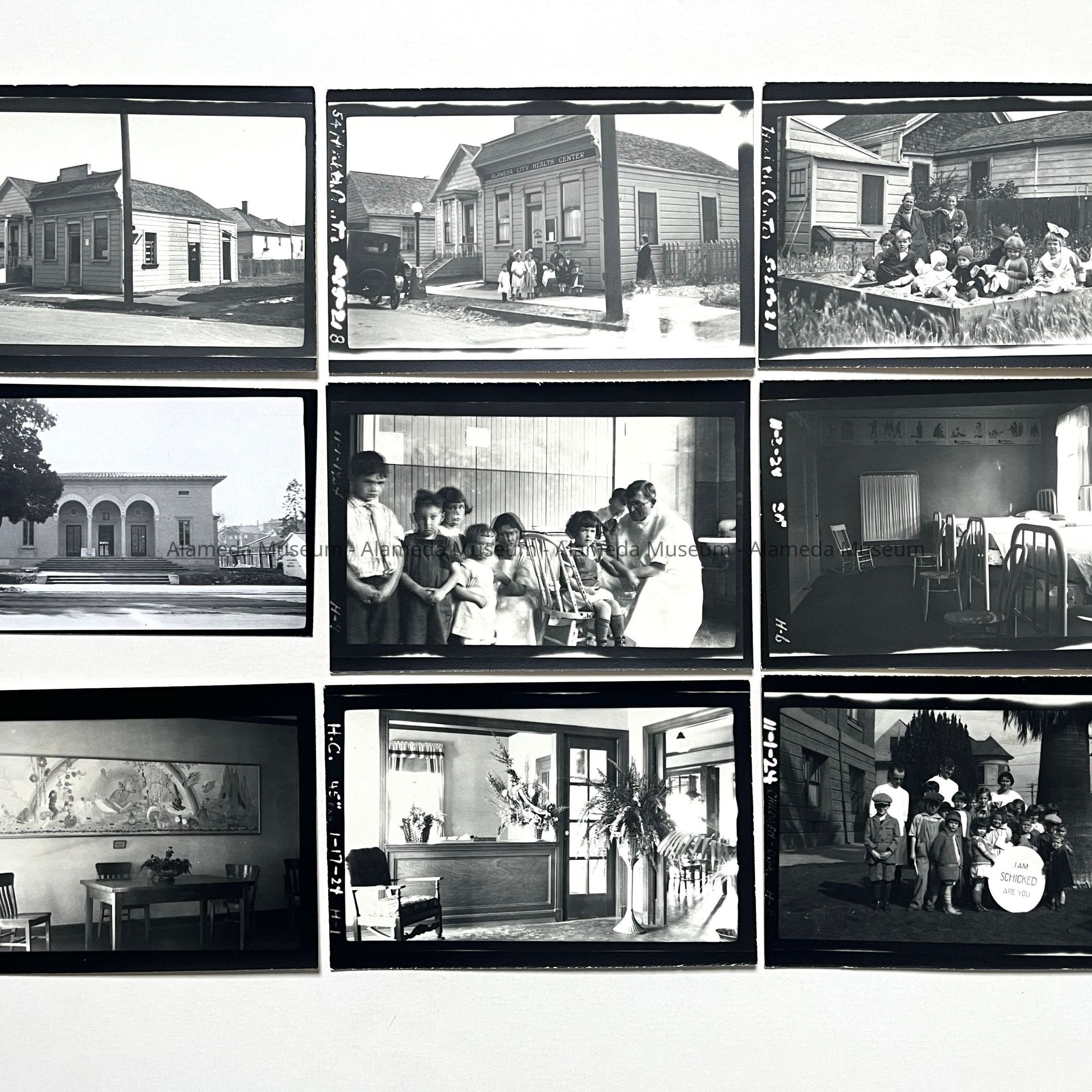 History of Object: Alameda City Health Center scenes: A) exterior view of old office at 1512 Oak St.; B) same, with children in front; C) children in sandbox behind old office; D) new office on Santa Clara Avenue; E) Dr. Hieronymous, Alameda County Medical Director, immunizing children; F) convalescent ward at the new office: G) reception area at new office; H) business office area; I) Diphtheria immunized children gathered in front of City Hall.