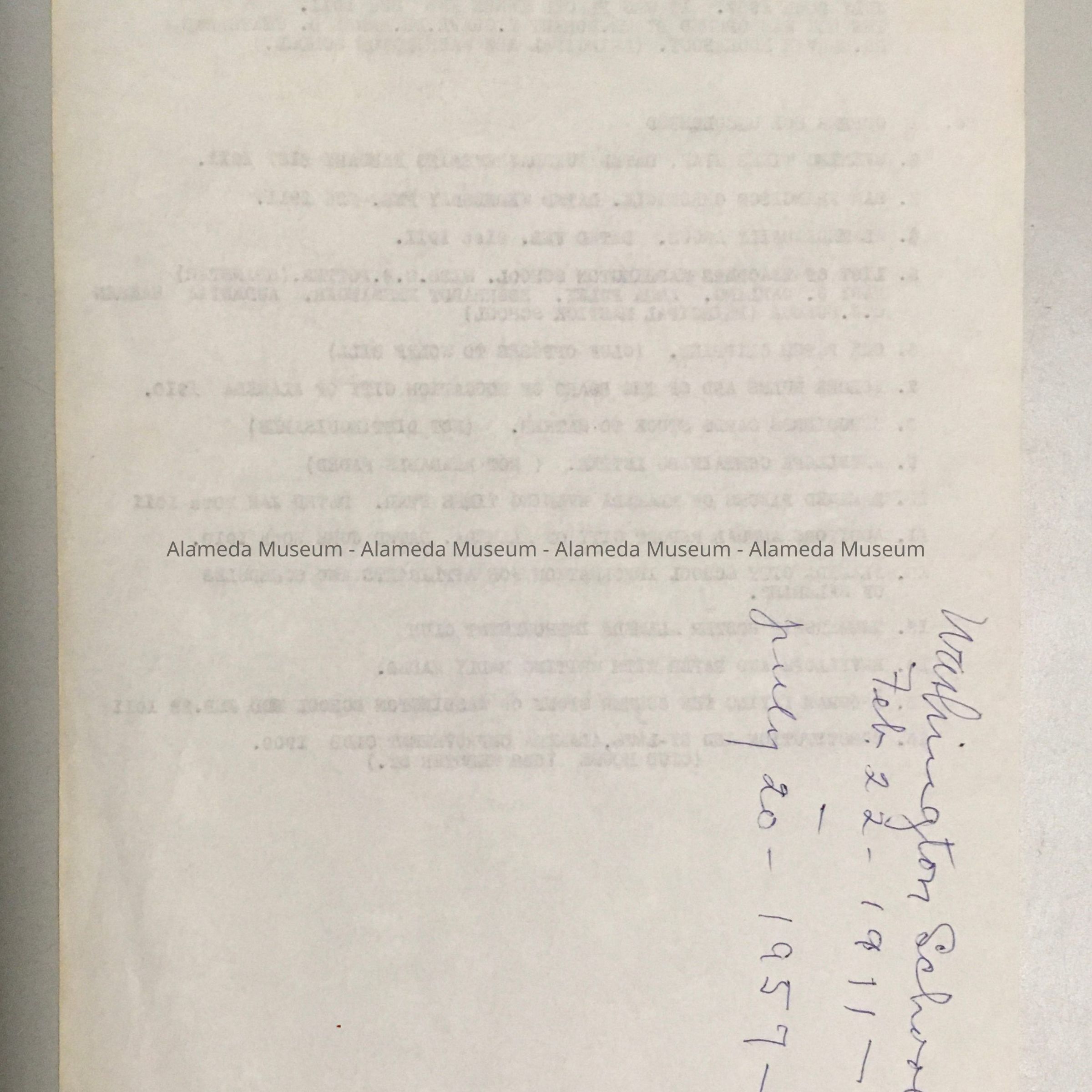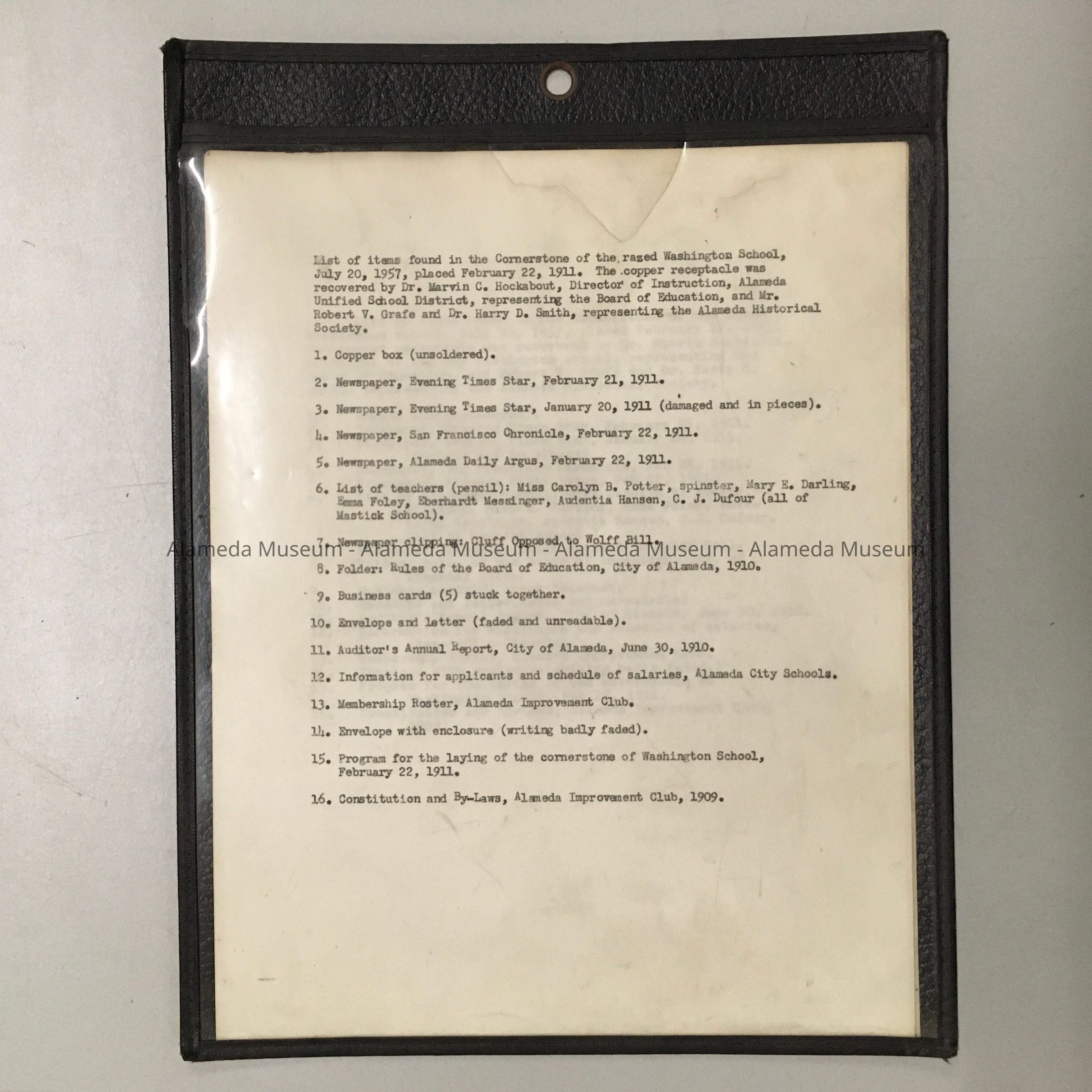 History of Object: 4 lists, in a holder, of contents from the cornerstone box from Washington School, built 1911, demolished 1956/1957. The box was laid in the cornerstone on February 22, 1911. After demolition of the school, the box was donated to the then newly founded Historical Society. However, the box had not been able to keep the contents safe, and the objects were not cataloged until 2021. The folder was found among moved Historical Society / Museum notes after minor reorganizations and are being added to the 2021 catalog entry after the fact. Handwriting on thr back of (b) appears to have been by former curator G. Gunn.
