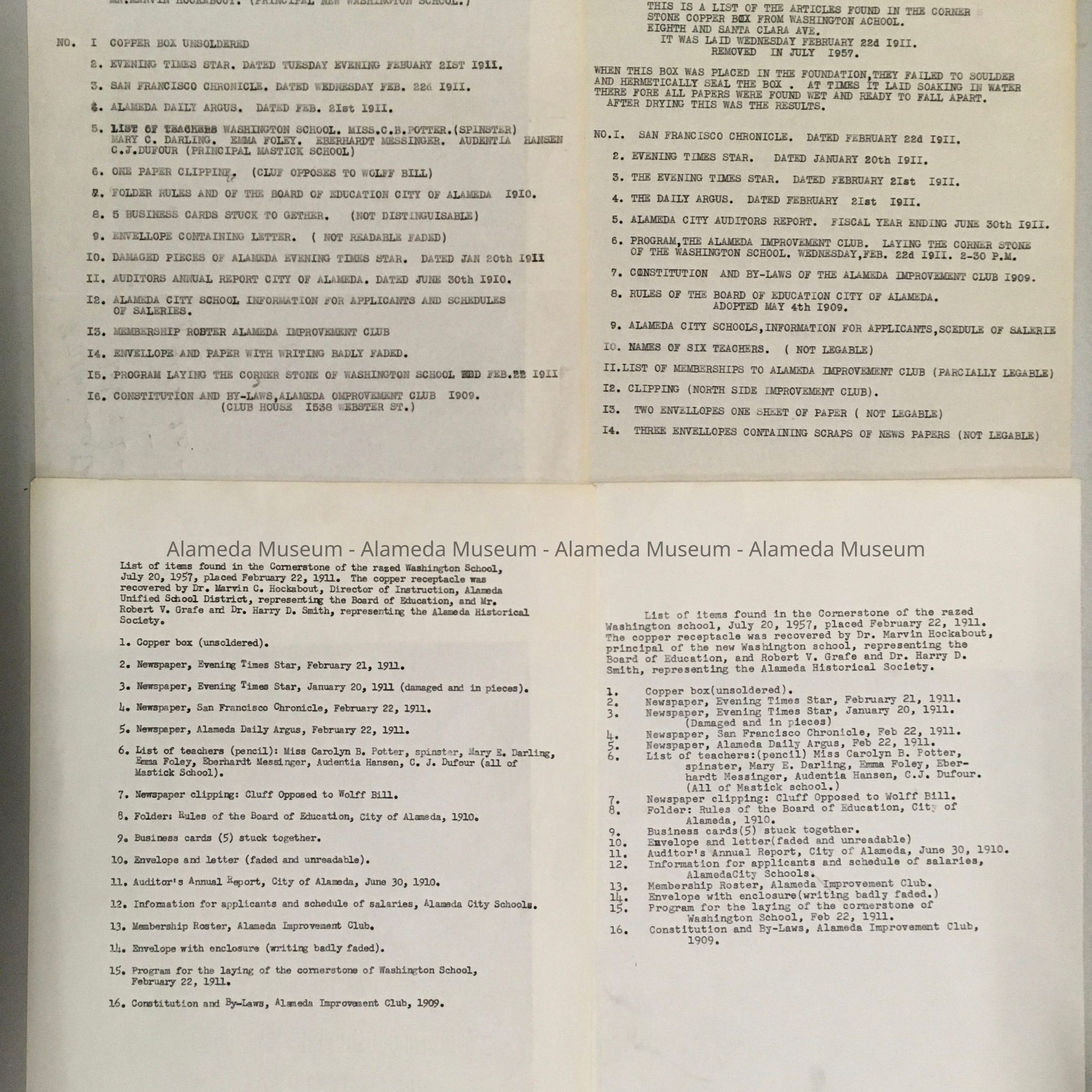 Contents lists of Washington School Cornerstone Box, c. 1957Entry/Object ID