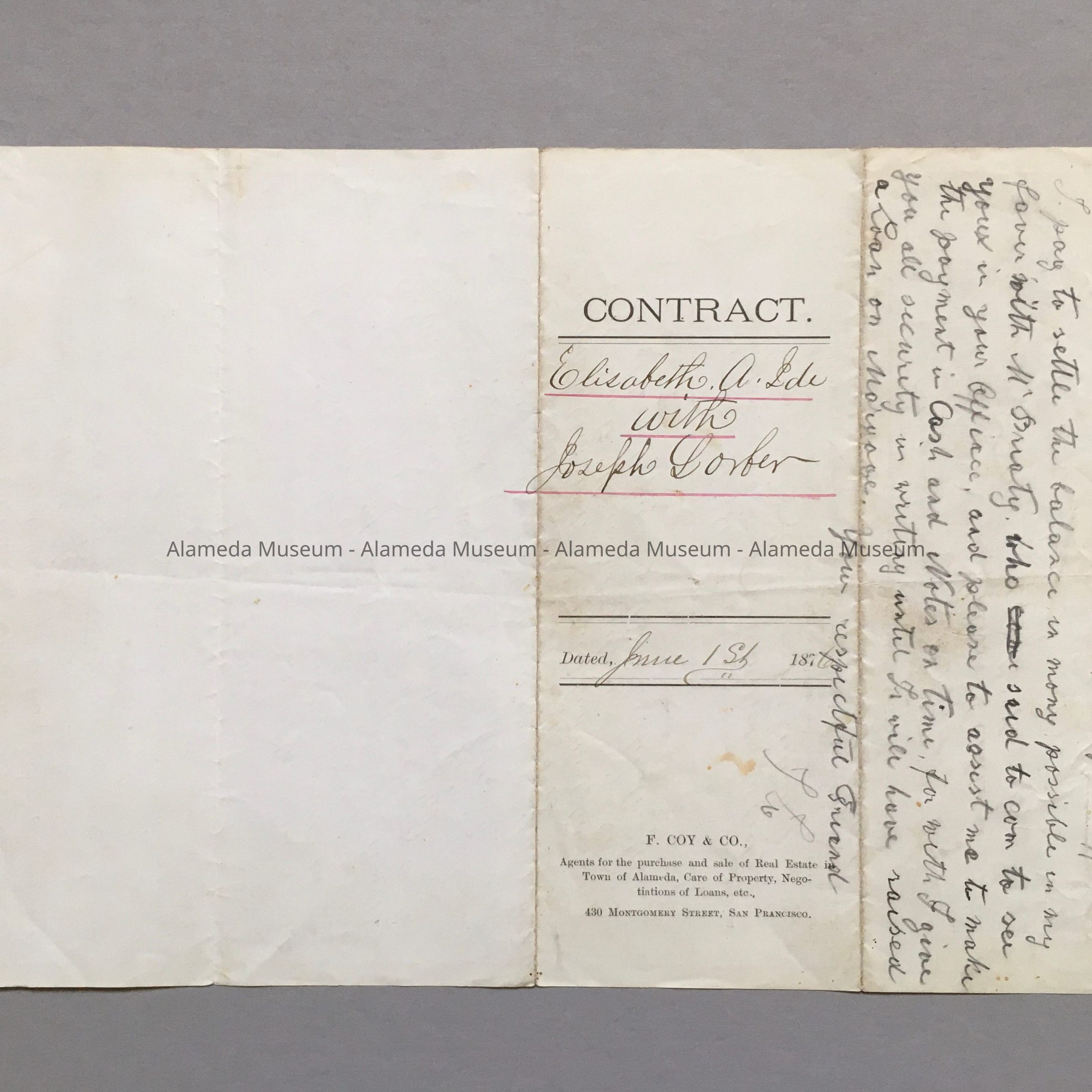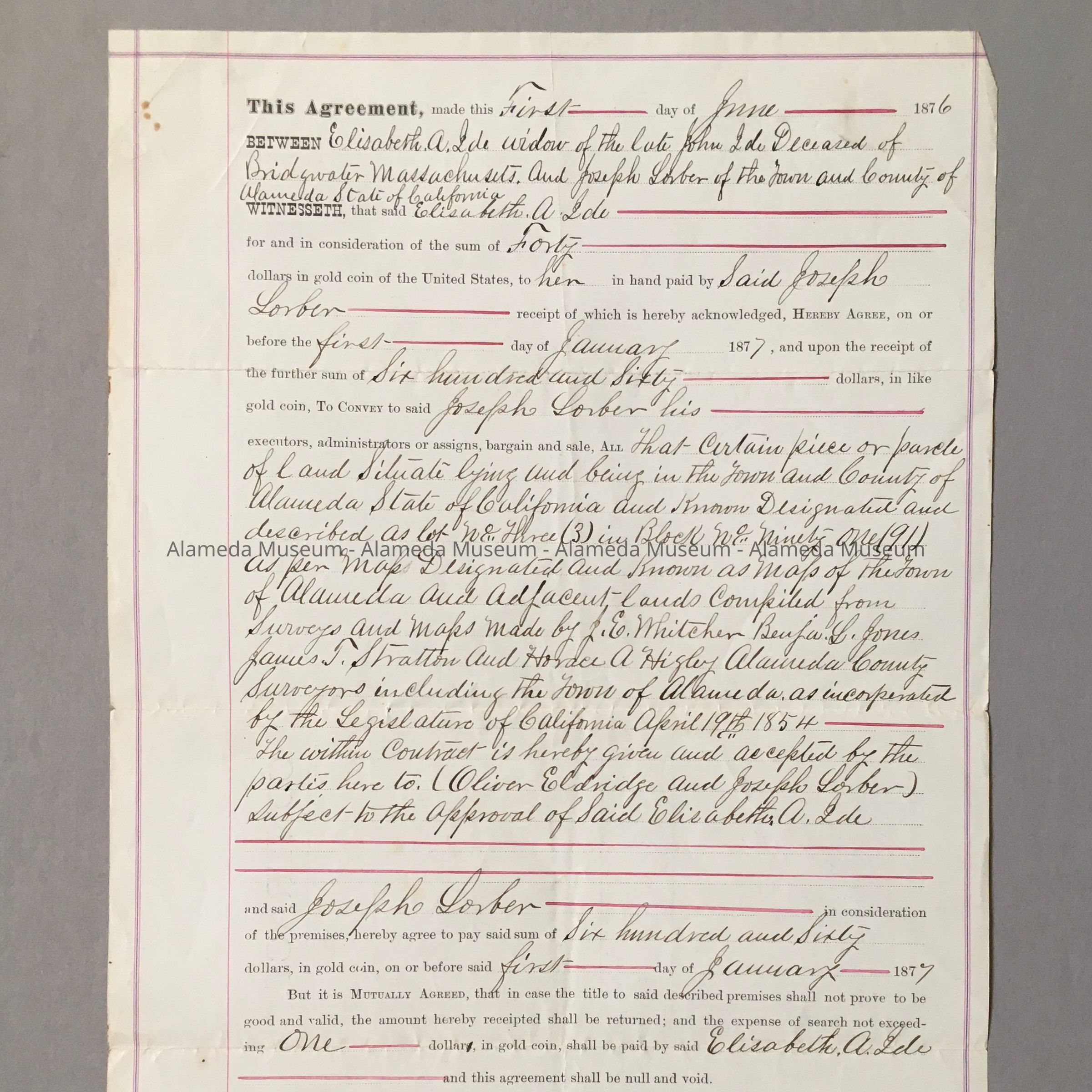 RECORD OF CONTRACT BETWEEN ELISABETH IDE AND JOSEPH LORBER, DATED JUNE 1, 1876, FOR PROPERTY LOCATED IN BLOCK #91, BEING LOT #3. THIS PROPERTY WOULD BE LOCATED AT VAN BUREN AND FOUNTAIN STREETS, EAST END, ALAMEDA, CALIFORNIA.