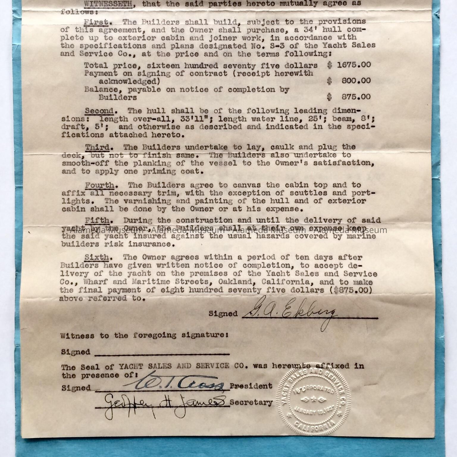 CONTRACT FOR THE CONSTRUCTION OF A 34-FT SLOOP FOR GUSTAF A EKBERG, DATED AUGUST 8, 1937. MR EKBERG RESIDED @ 1807 ELM STREET, ALAMEDA AT THAT TIME.