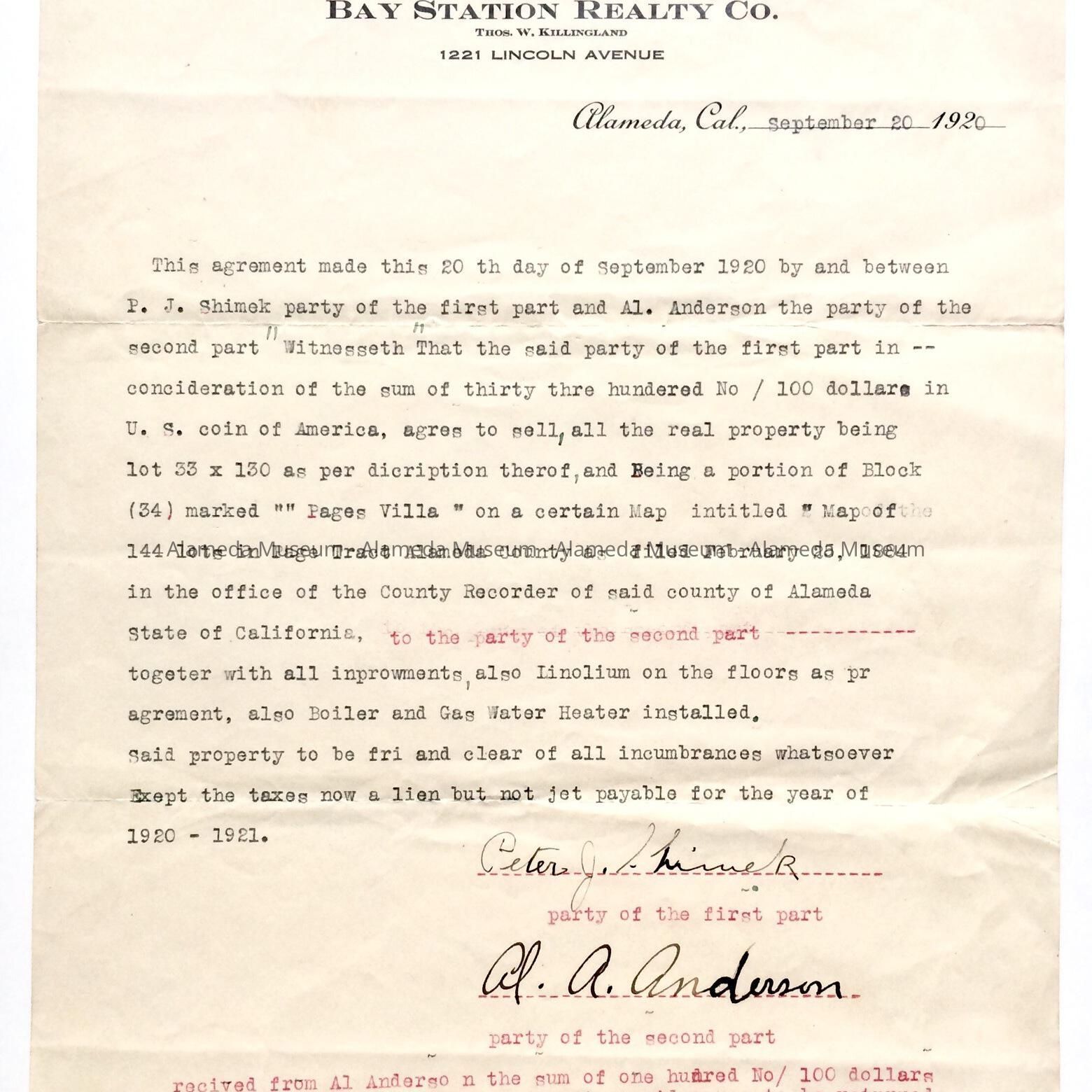 Typewritten contract stating that Alfred A. Anderson agrees to pay P. J. Shimek $3,300 for the property known as 1614 Bay Street, Alameda.
