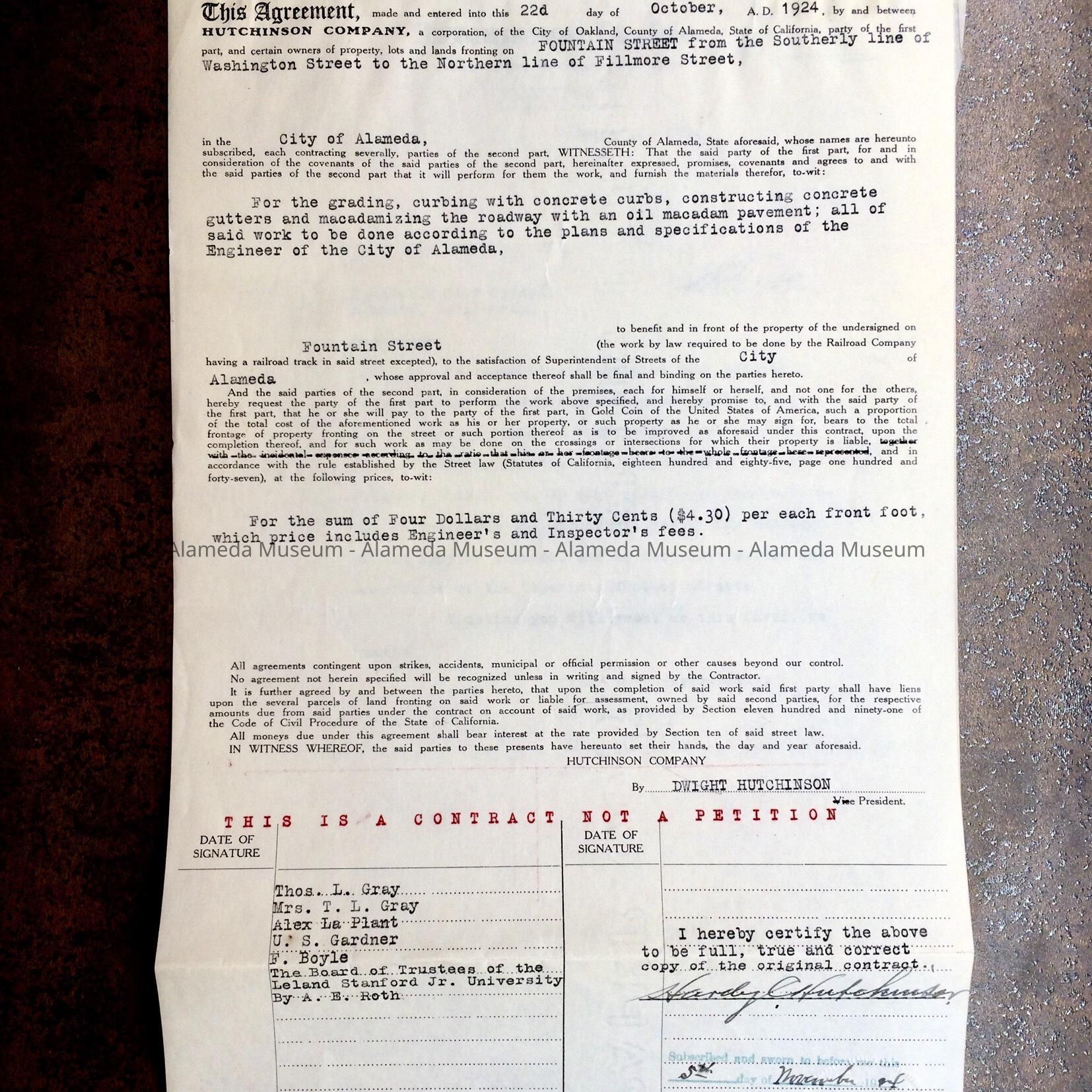 A CONTRACT BETWEEN THE CITY OF ALAMEDA AND THE HUTCHINSON COMPANY TO GRADE, CURB, AND CONSTRUCT CONCRETE GUTTERS AND MACADAMIZE THE ROADWAY ON FOUNTAIN STREET BETWEEN WASHINGTON AND FILLMORE AVENUES.