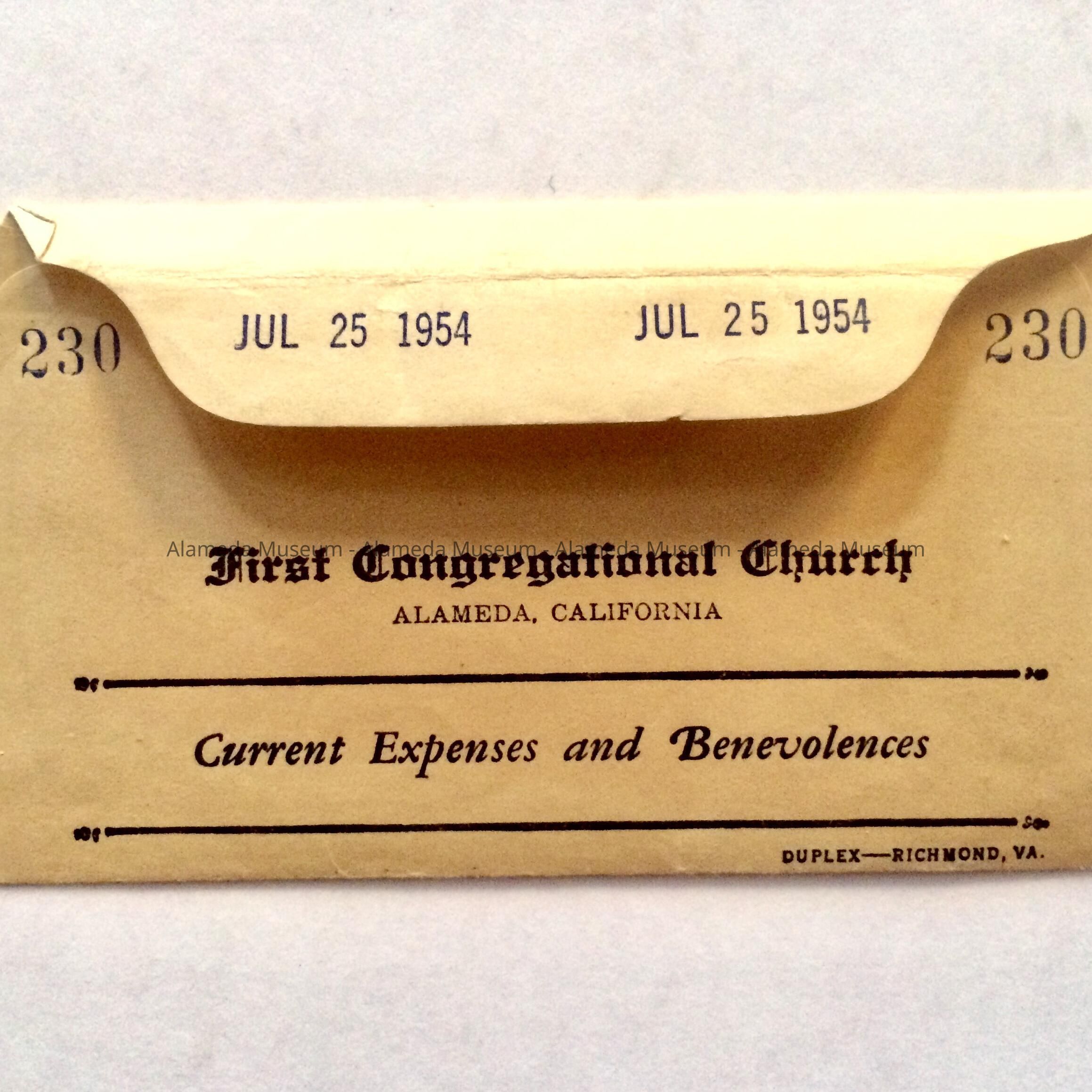 CONTRIBUTION OR TITHING ENVELOPE, FIRST CONGREGATIONAL CHURCH, ALAMEDA, CALIFORNIA, DATED JULY 25, 1954.