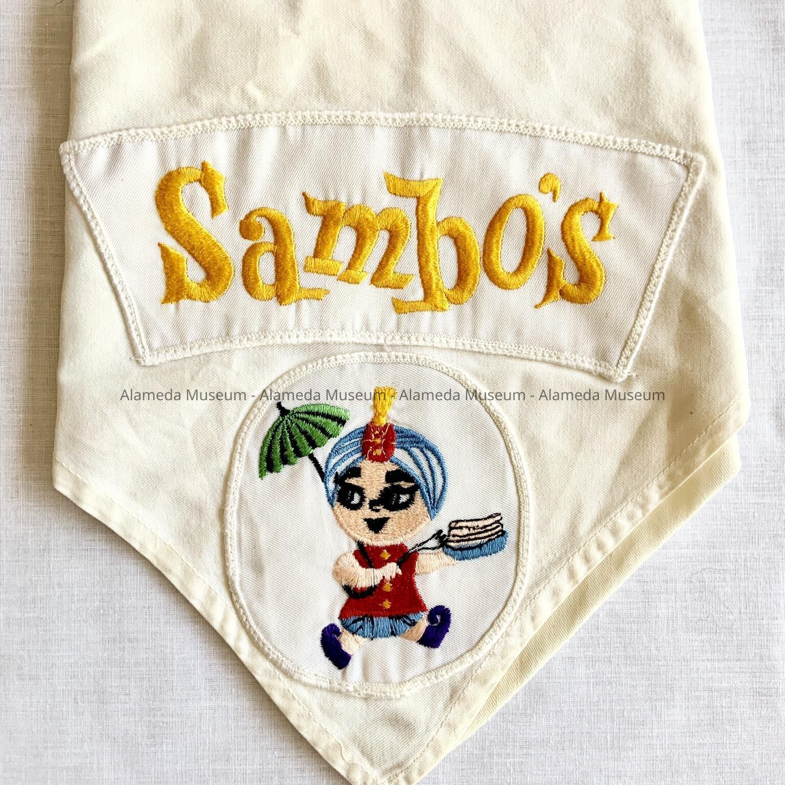 Description: Three triangular white linen neckerchiefs each with two appliqués affixed: (1) a "SAMBO'S embroidered in gold thread (patch measures L-3” x W–7” inches) and below this is the restaurant logo (Sambo holding a stack of pancakes) on a patch with multi-colored threads, about 4 x 4 inches. Neckerchiefs A and B measure 39 x 30 x 30 inches; C measures 34 x 23 x 23 inches.