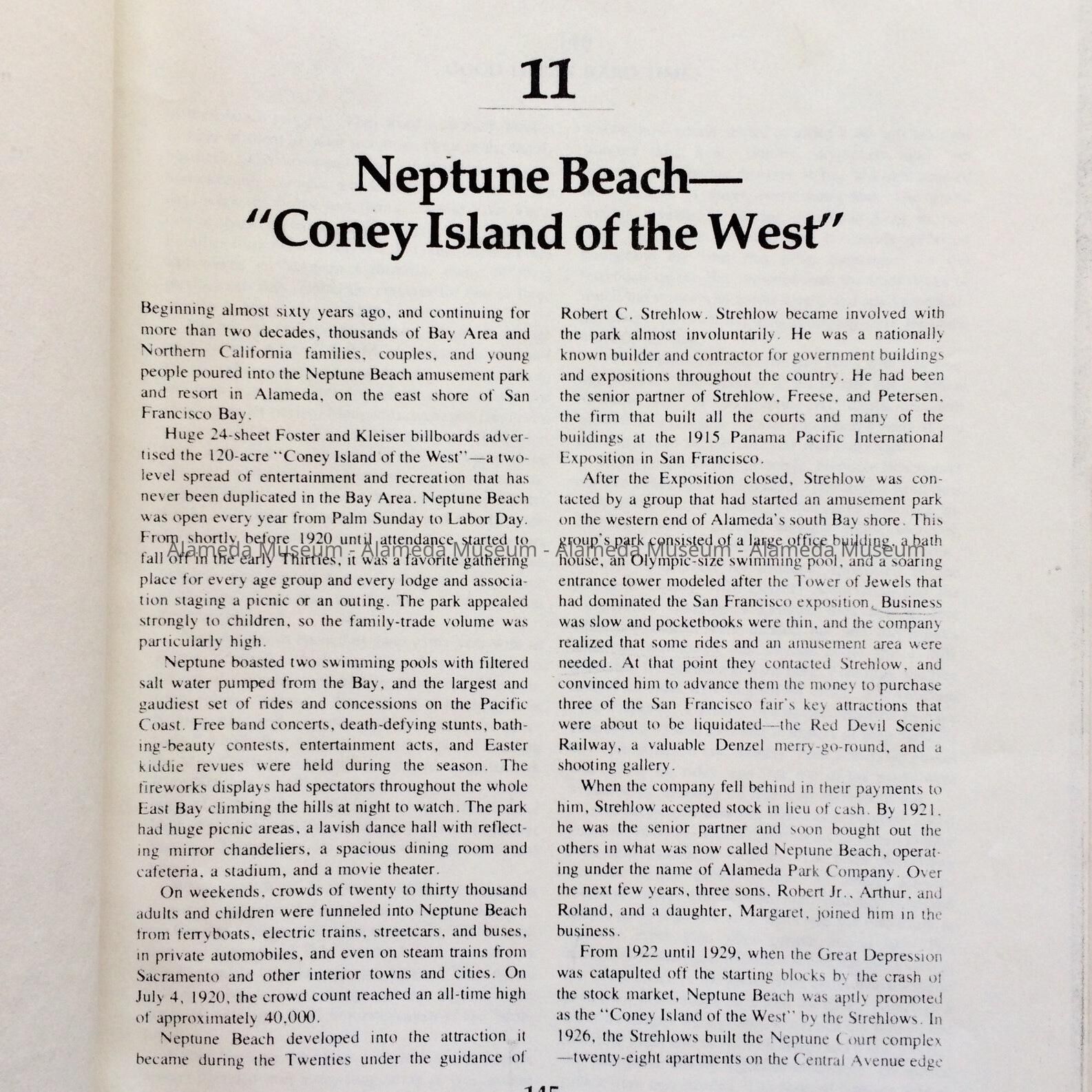 History: Copy of Chapter 11 on Neptune Beach taken from the book "Good Life in Hard Times" by Jerry Flamm c/ 1977, Chronicle Books, San Francisco.