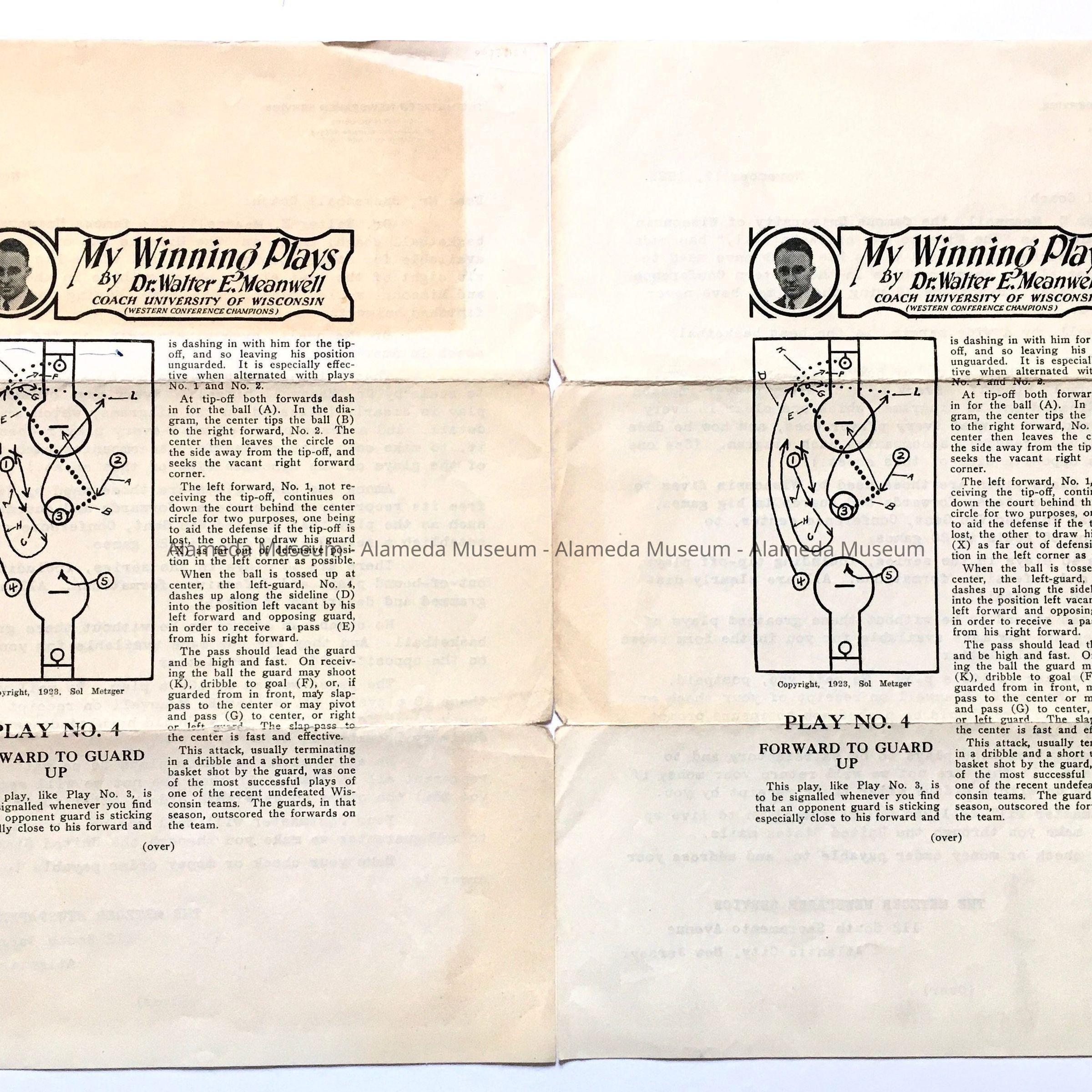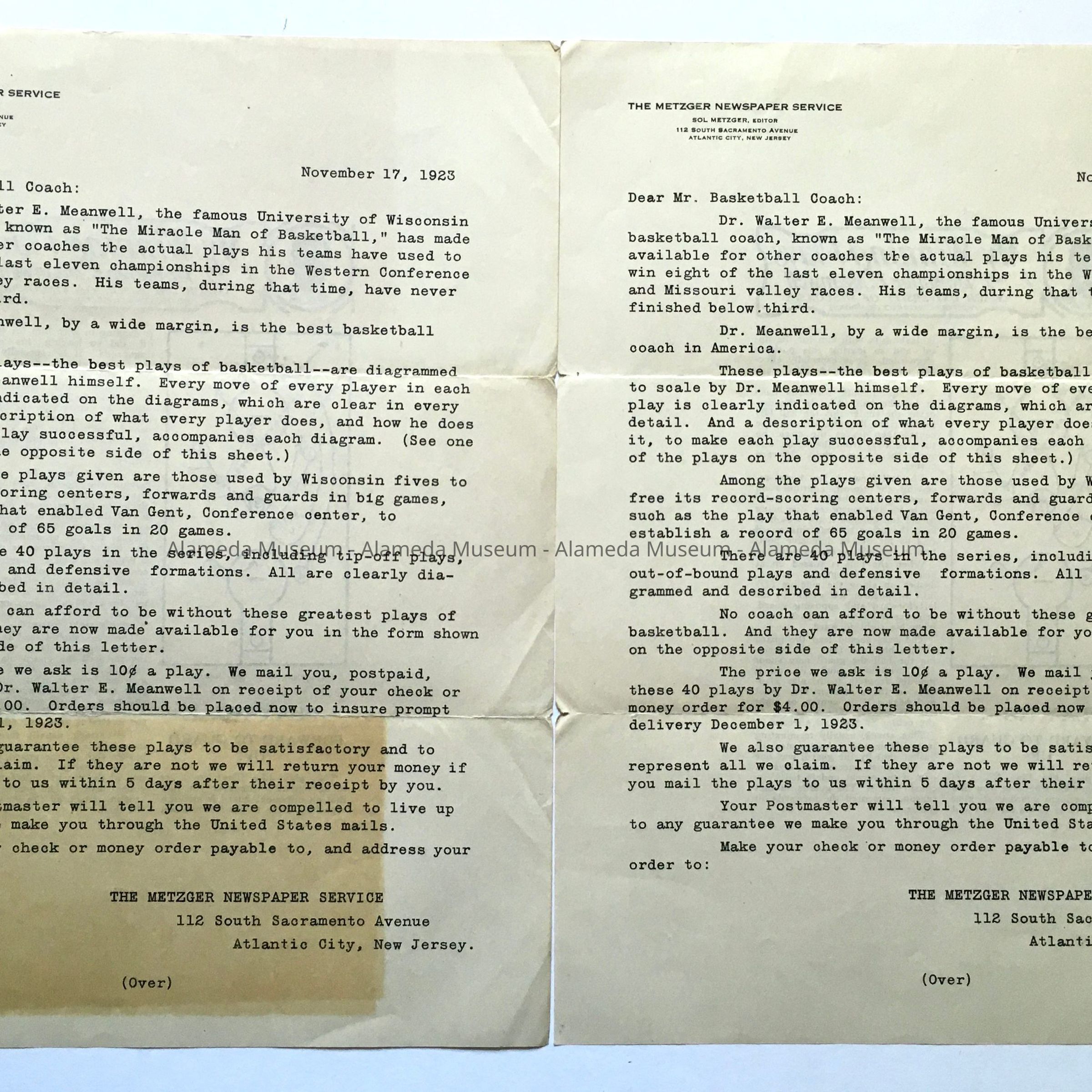 Description: Two copies of a form letter by the Metzger Newspaper Service, dated November 17, 1923, and addressed to Mr. Basketball Coach, that advertises basketball plays developed by Dr. Walter E. Meanwell. On back of letter is a sample of a meanwell maneuver, Play no. 4, with line drawing of movements.